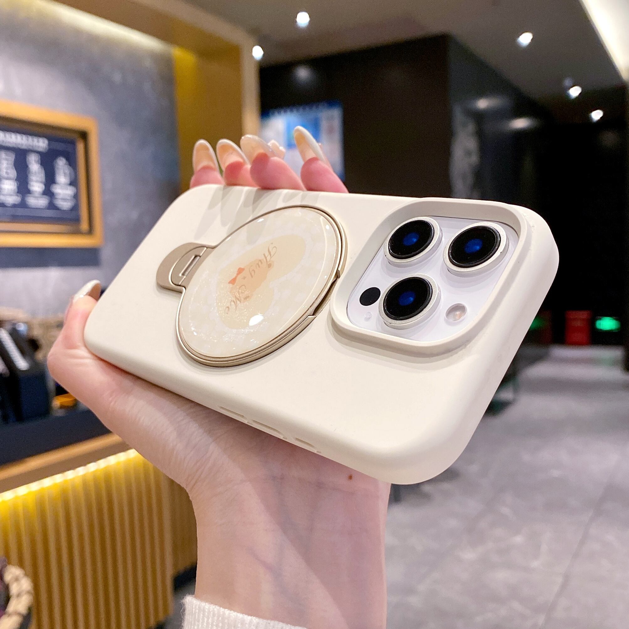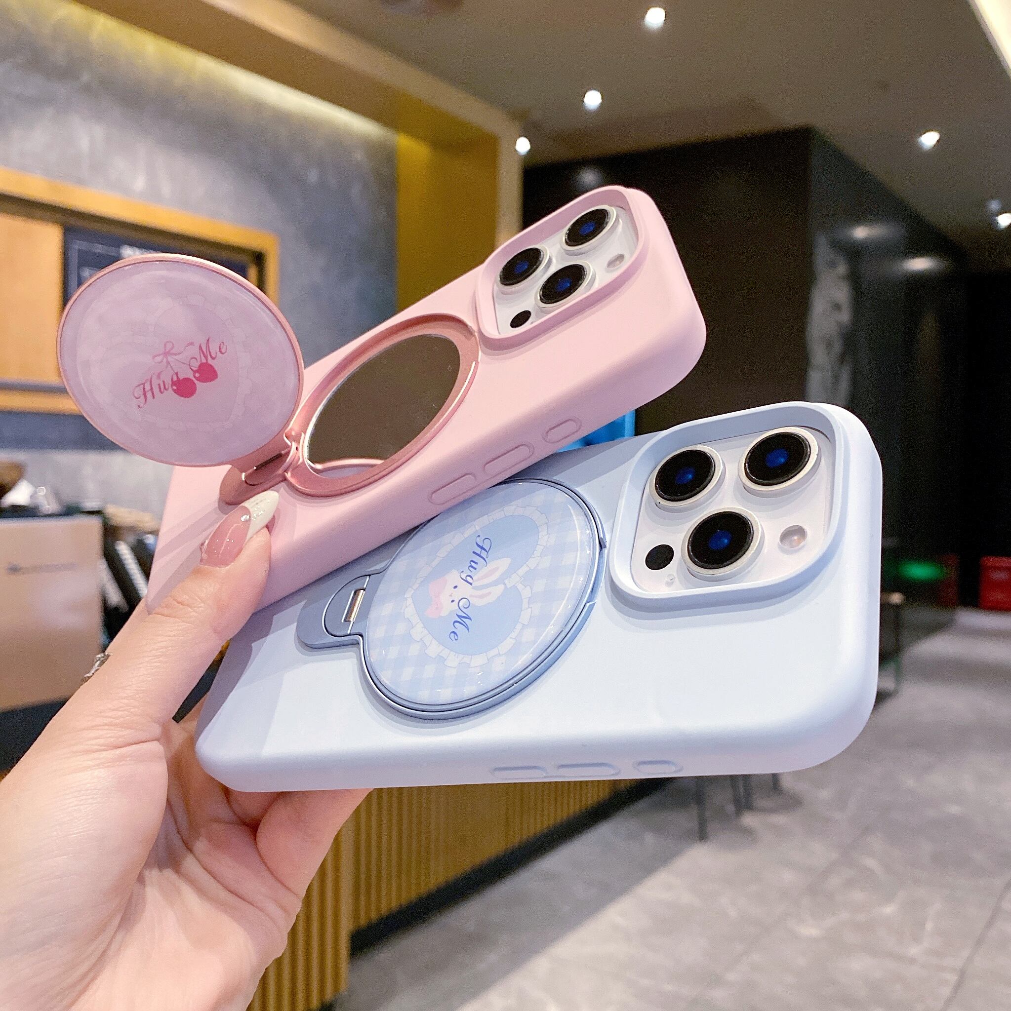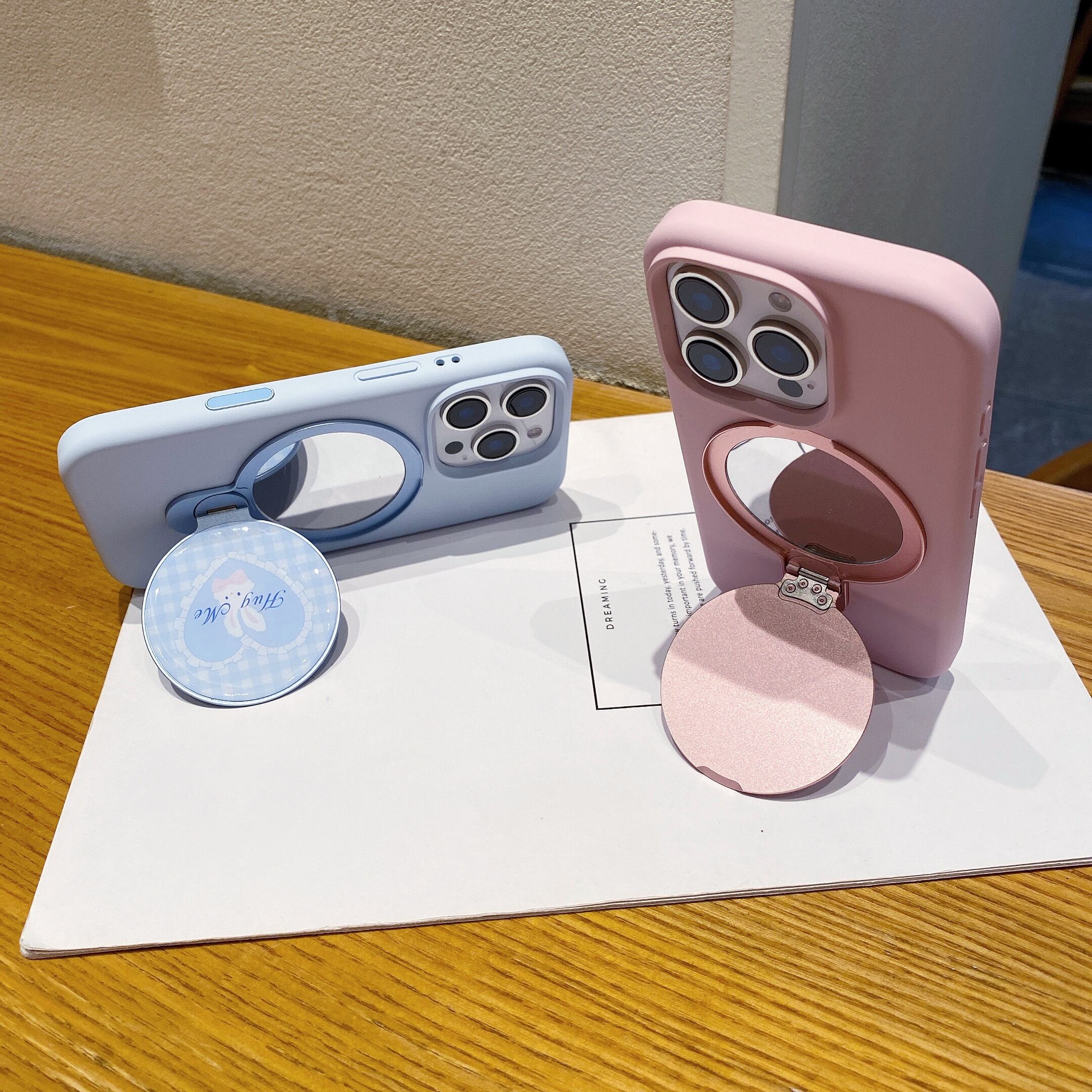 ミラー付き iPhone 16/15/14/13 リキッド シリコンケース 360度回転 スマホスタンド 耐衝撃