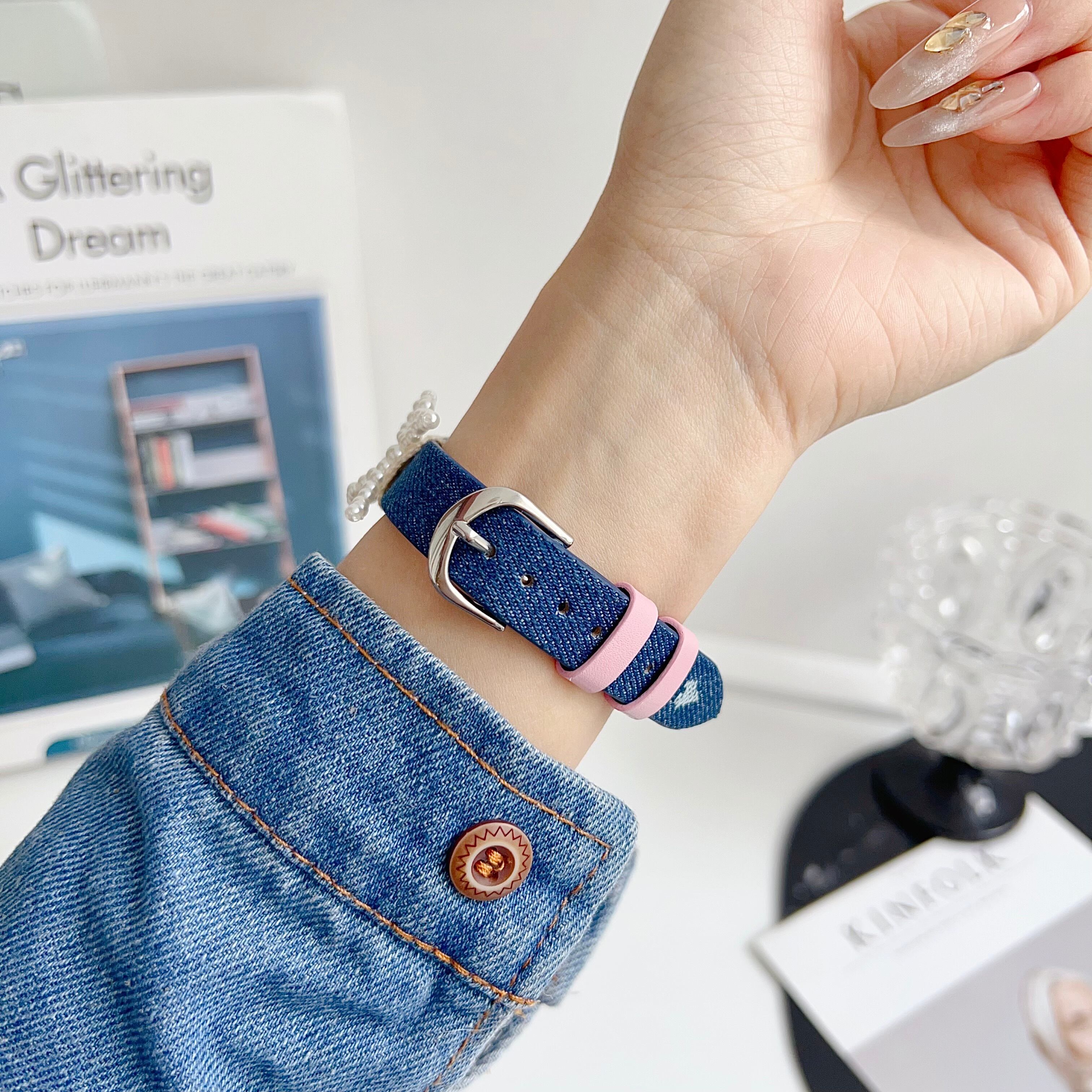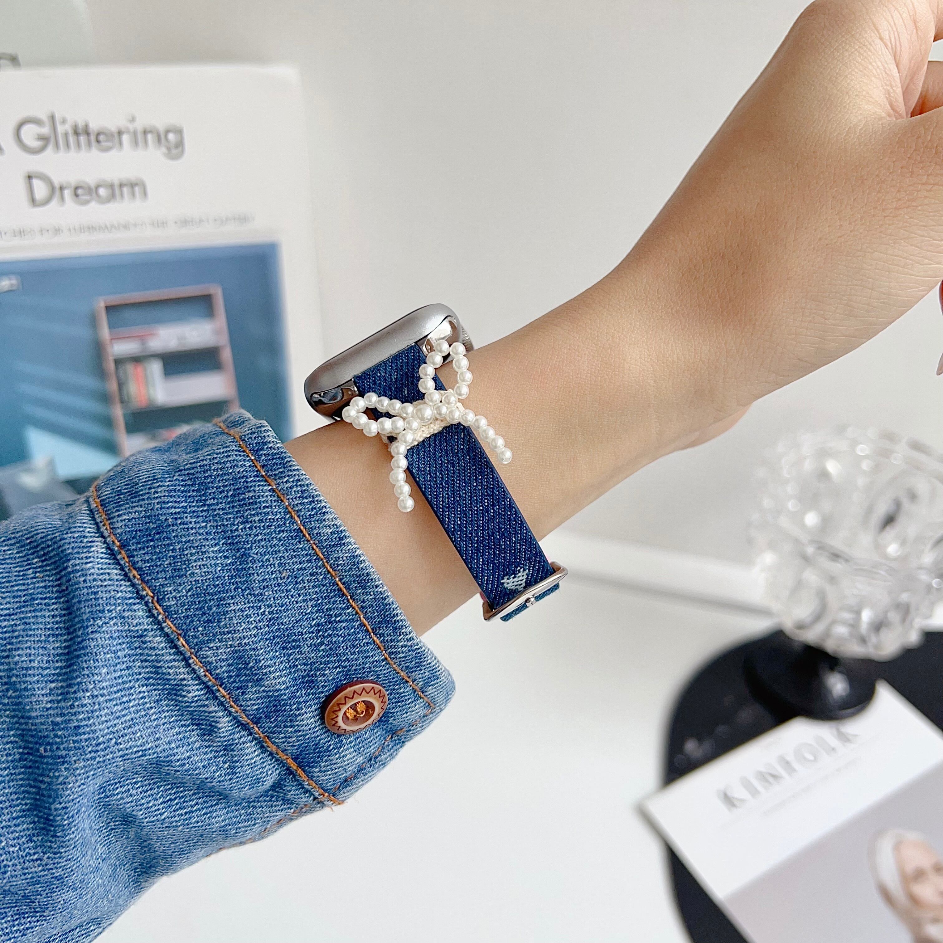 パールリボン Apple Watch バンド デニム柄 かわいい Series 10 9 8 7 6 SE対応 アップルウォッチ ベルト 韓国風