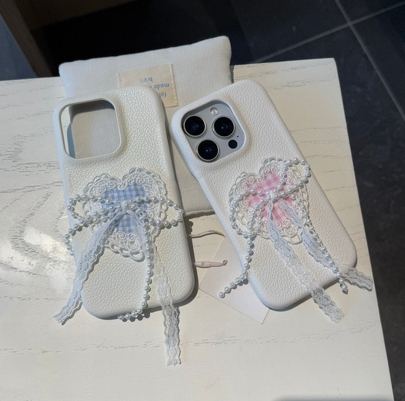 大人可愛い パールリボン iPhone 16 15 14 13 12 ケース ハートレース チェック柄 スマホカバー