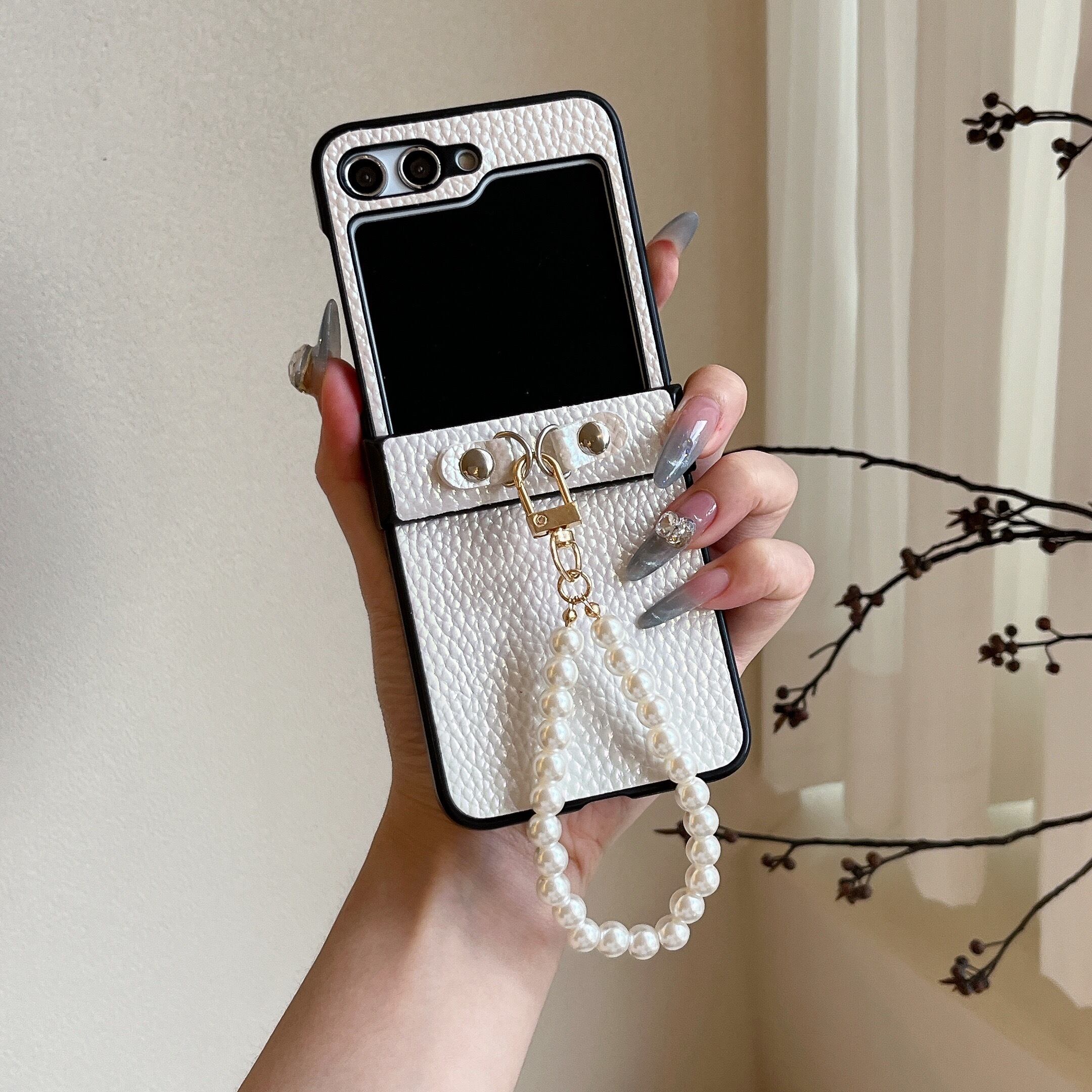 パール調のストラップで手首にかけやすく、落下防止にも◎