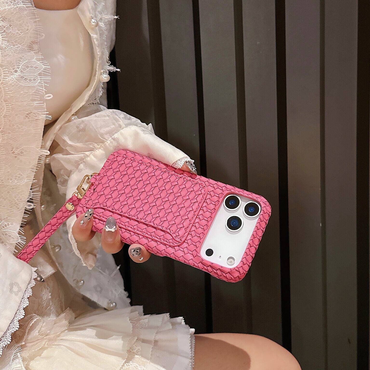 編み柄 iphone 17 16 15 14 13 12 11 ケース おしゃれ カード収納 ハンドストラップ付き アイフォンケース puレザー 背面ケース
