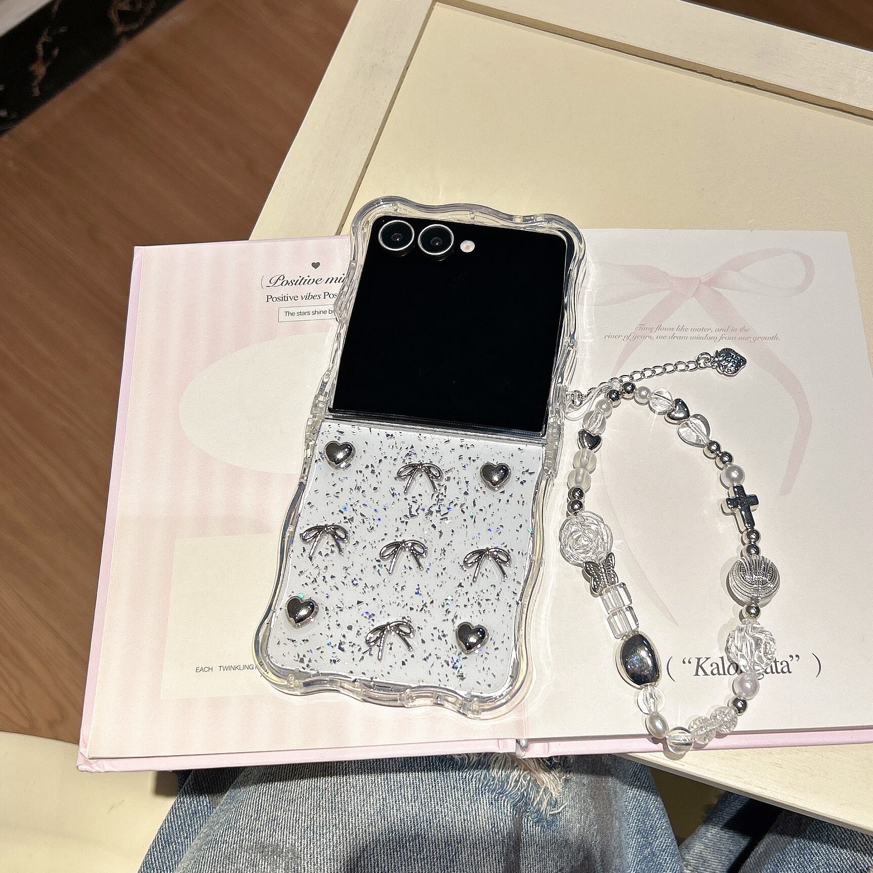リボン Galaxy Z Flip 7 6 5 4 3 ケース ウエーブフレーム 透明感 かわいい ハート ラメ入り クリアケース スマホストラップ