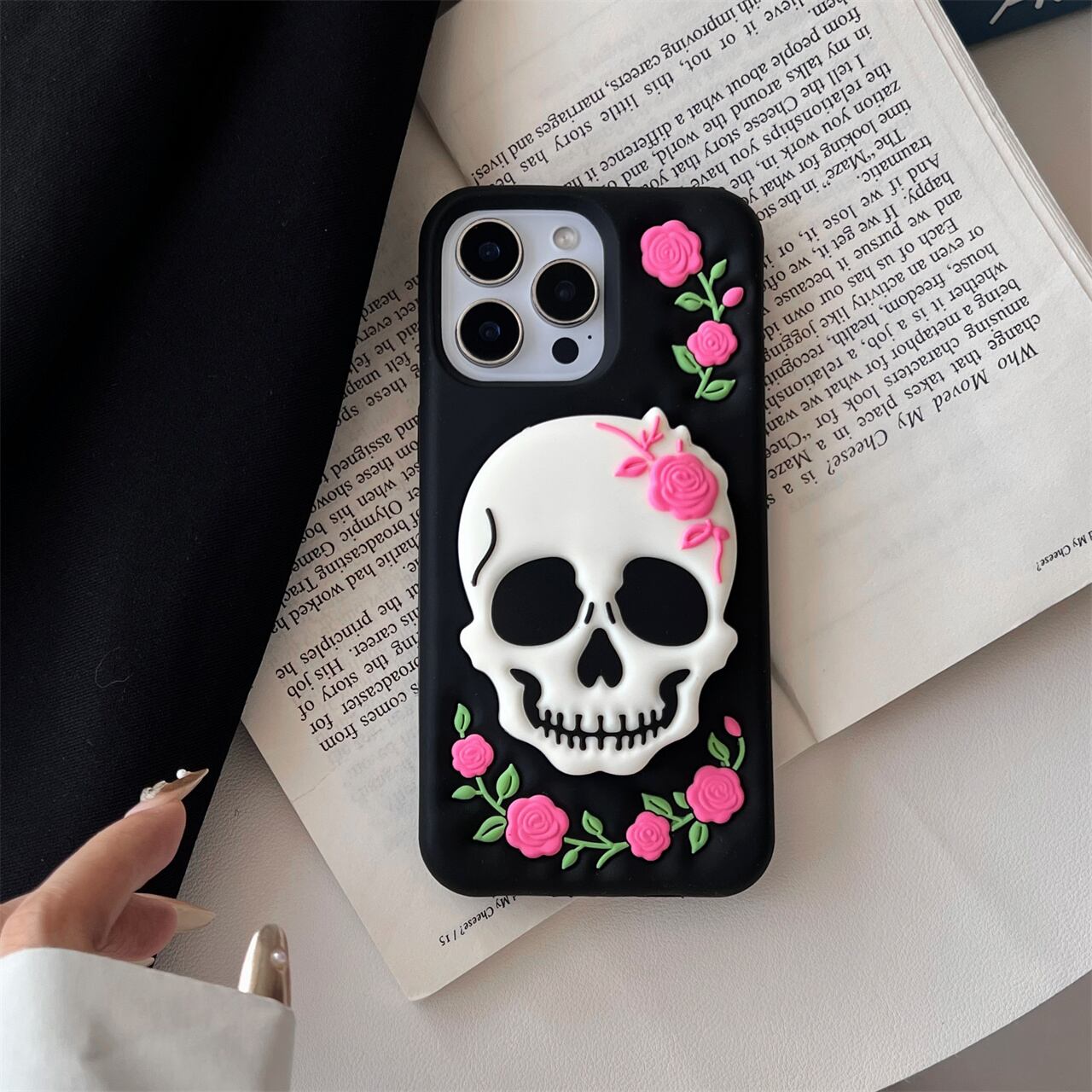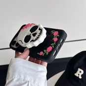 ドクロ&ローズ iPhone 16 15 14 13 12 11 ケース 立体 スタンド機能 シリコンケース かわいい スマホカバー