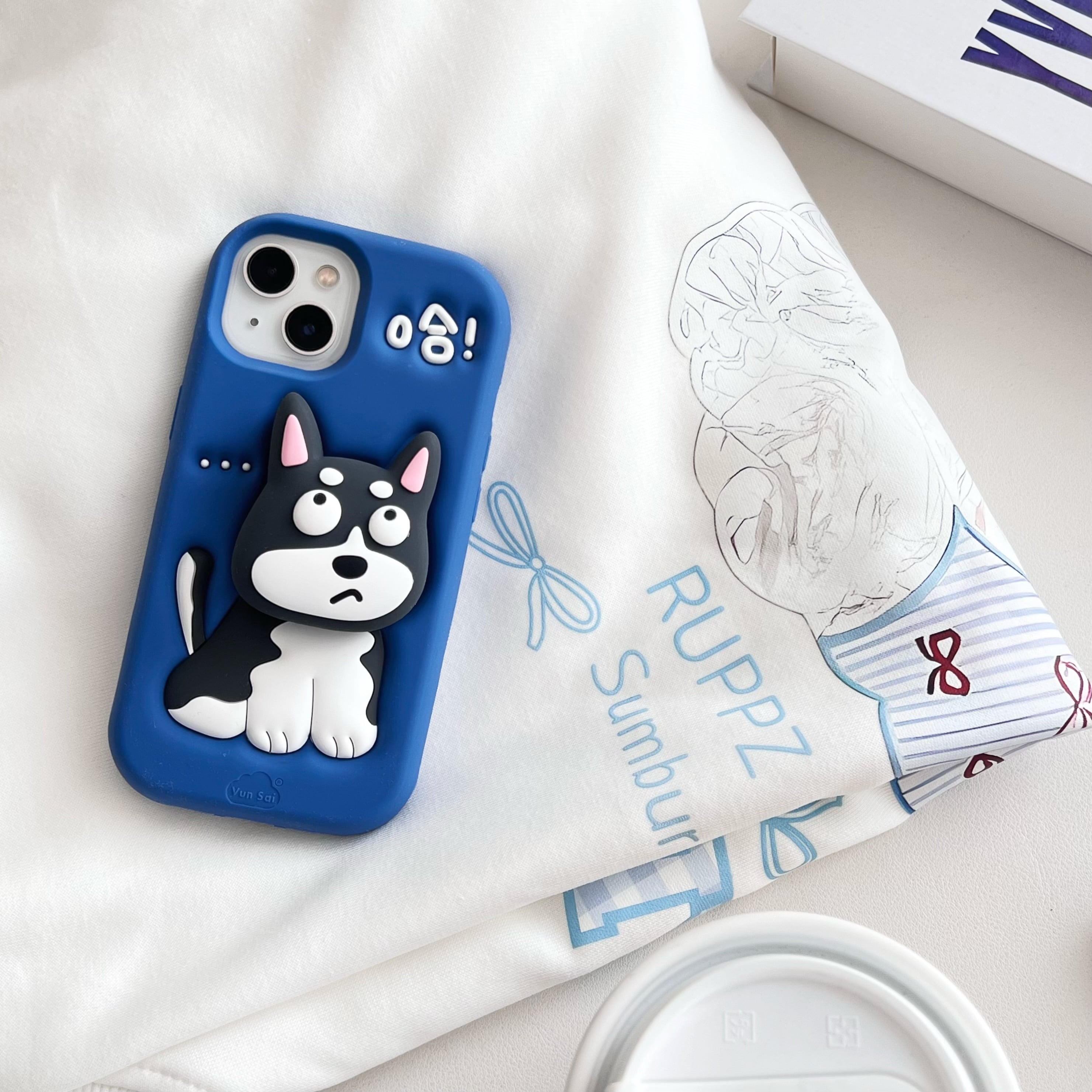 ローヤルブルー色のケースに、ハスキーがアクセントになり、