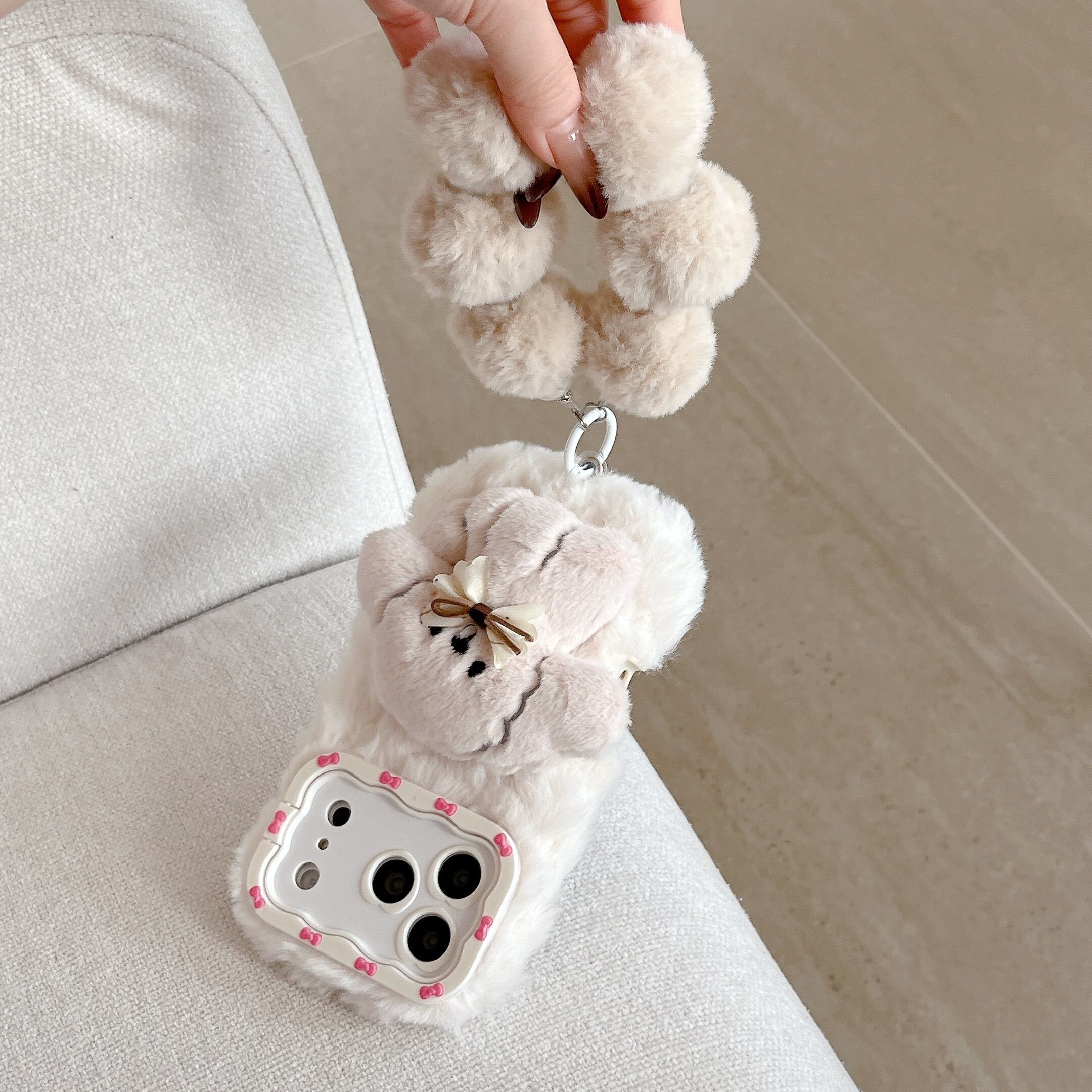 もこもこ くま&犬 iPhone 17 16 15 14 13 ケース かわいい ワンちゃん ベア ふわふわ スマホケース ファーボール スマホストラップ