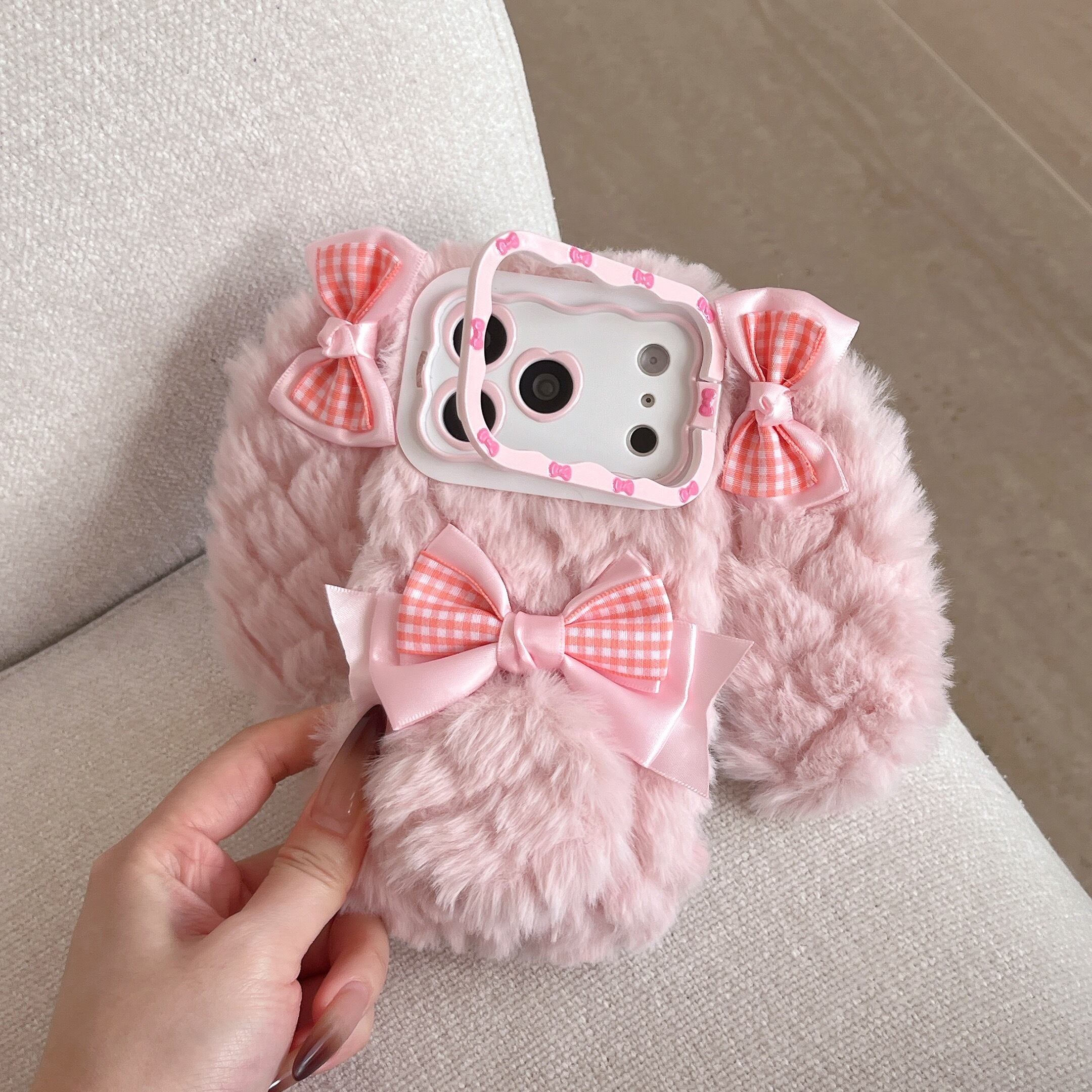 ぬいぐるみ iPhone 17 16 15 14 13 ケース もこもこ リボン ウサギ スマホケース スタンド機能 うさみみ かわいい
