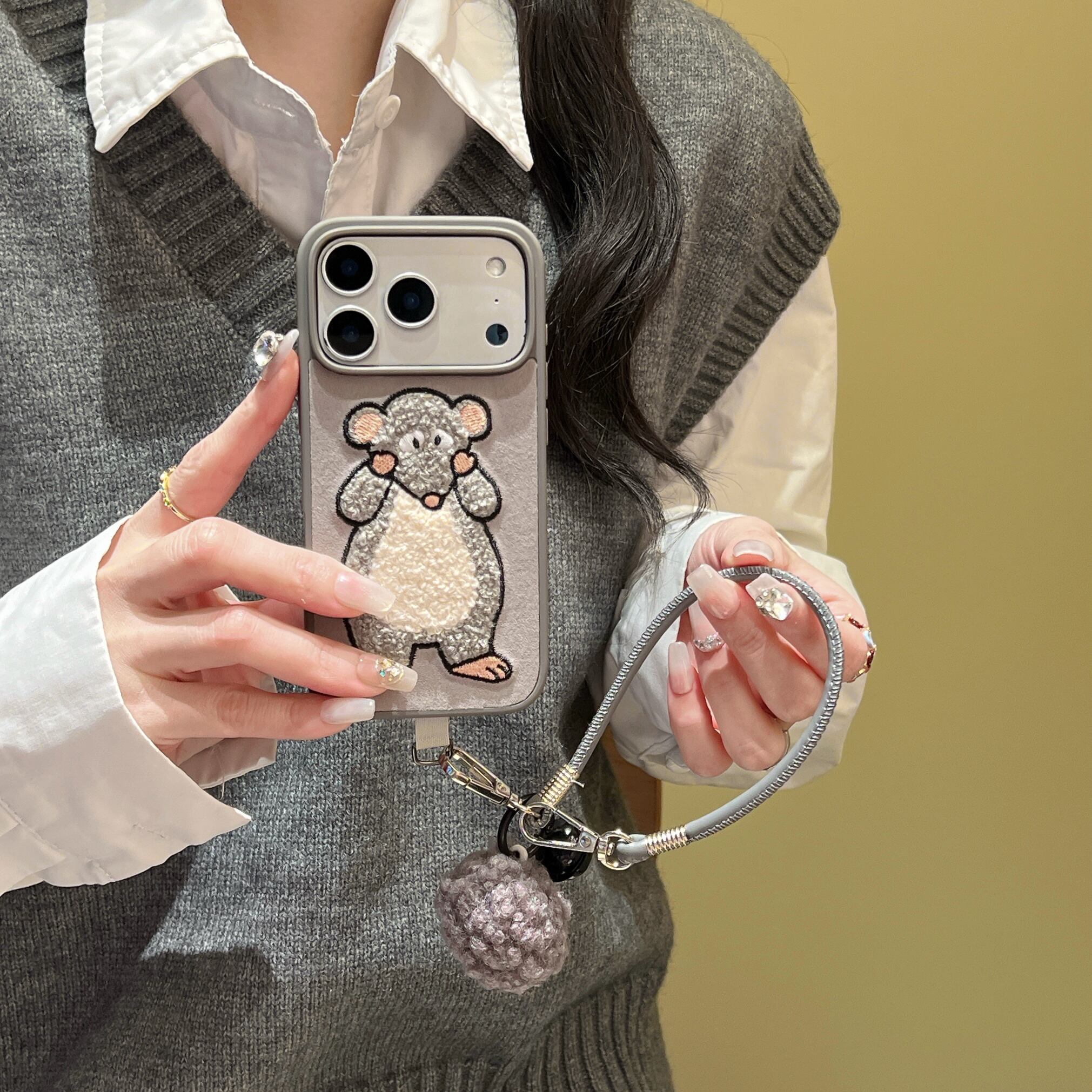 ネズミ 刺繍 iphone 17 16 15 14 ケース 可愛い ハンドストラップ スマホケース