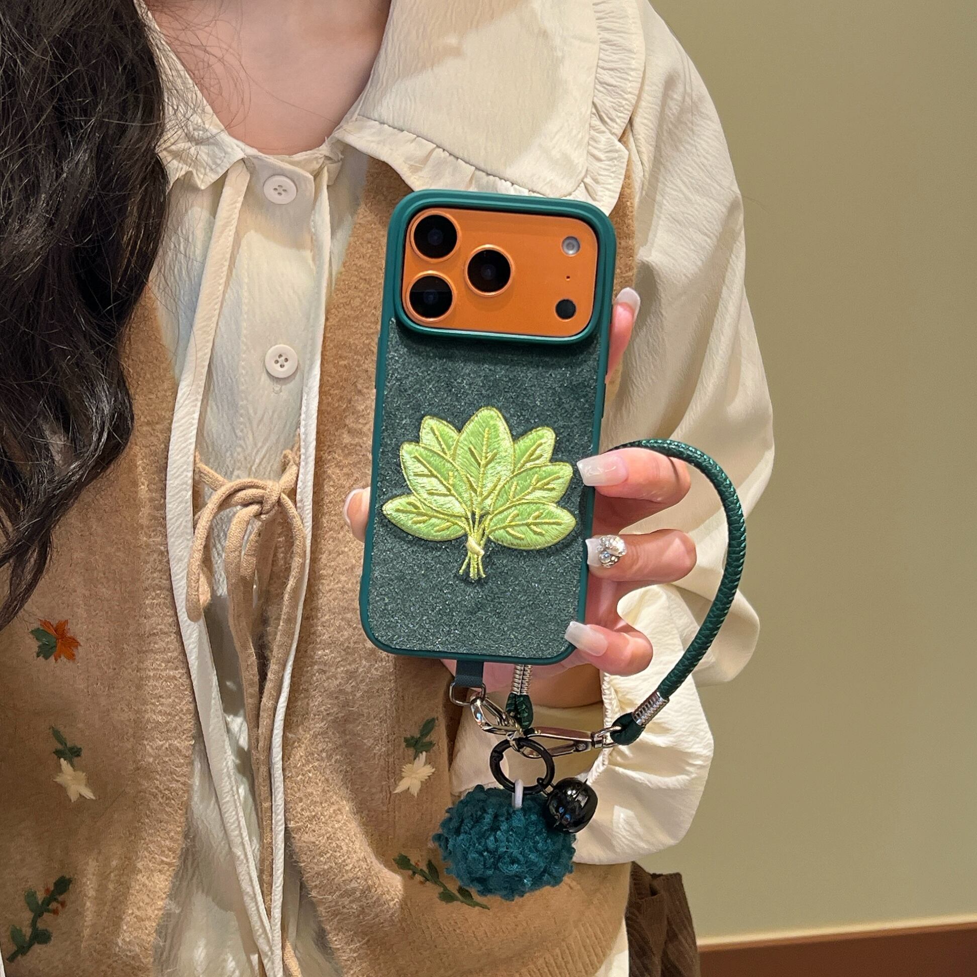 木の葉 刺繍 iphone 17 16 15 14 ケース 可愛い ハンドストラップ スマホケース