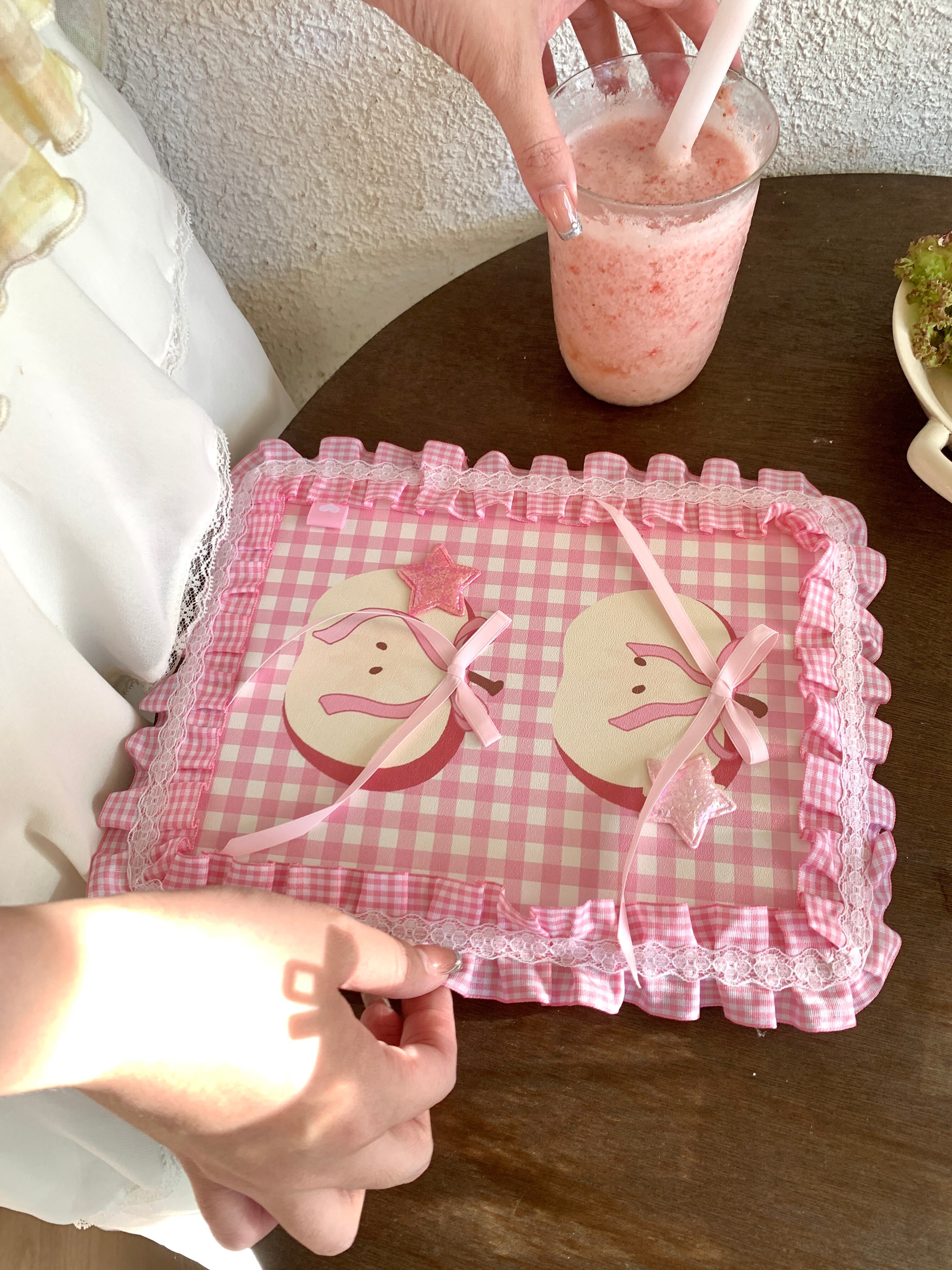やさしいピンクトーンのチェック柄をベースに、