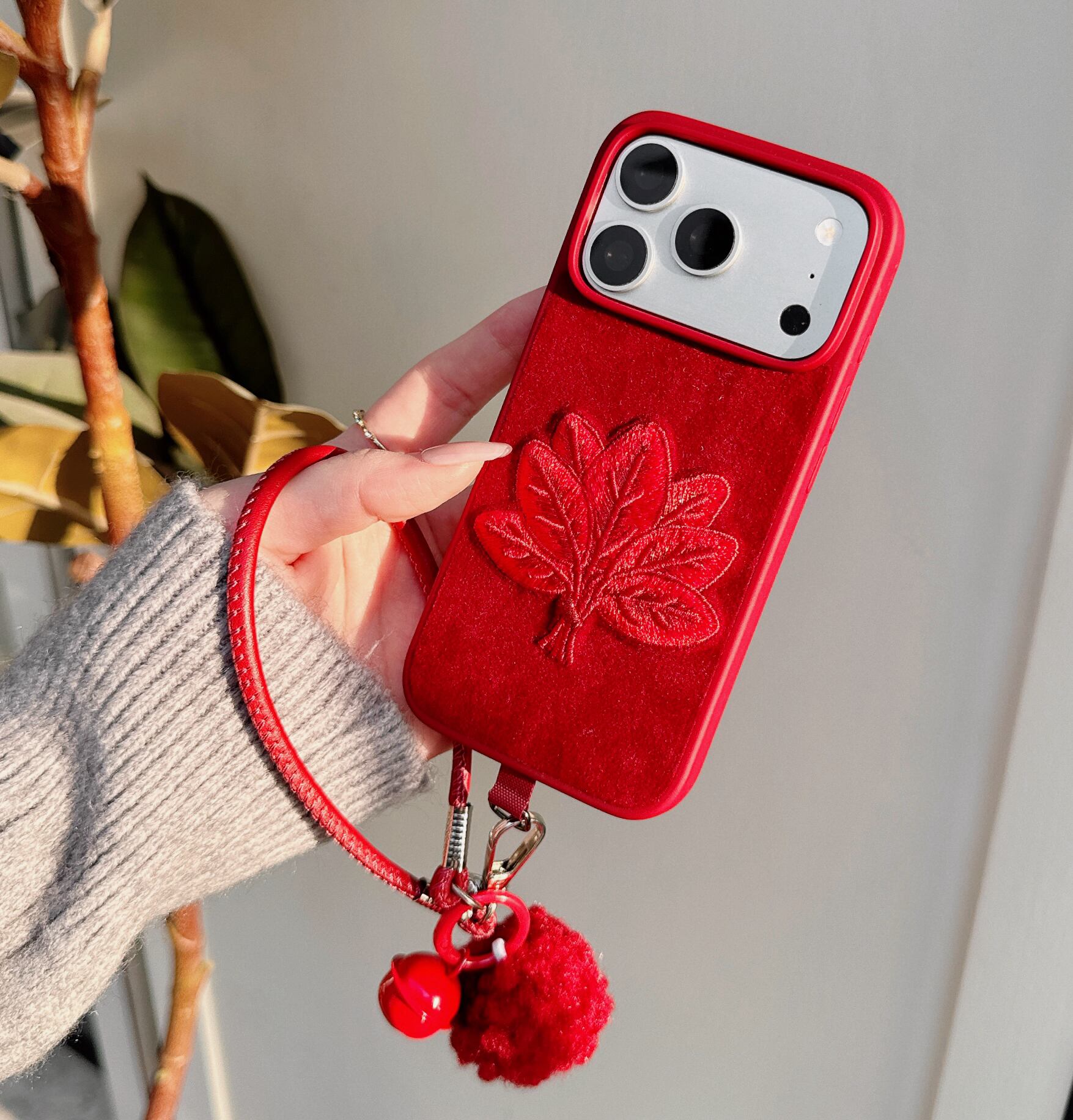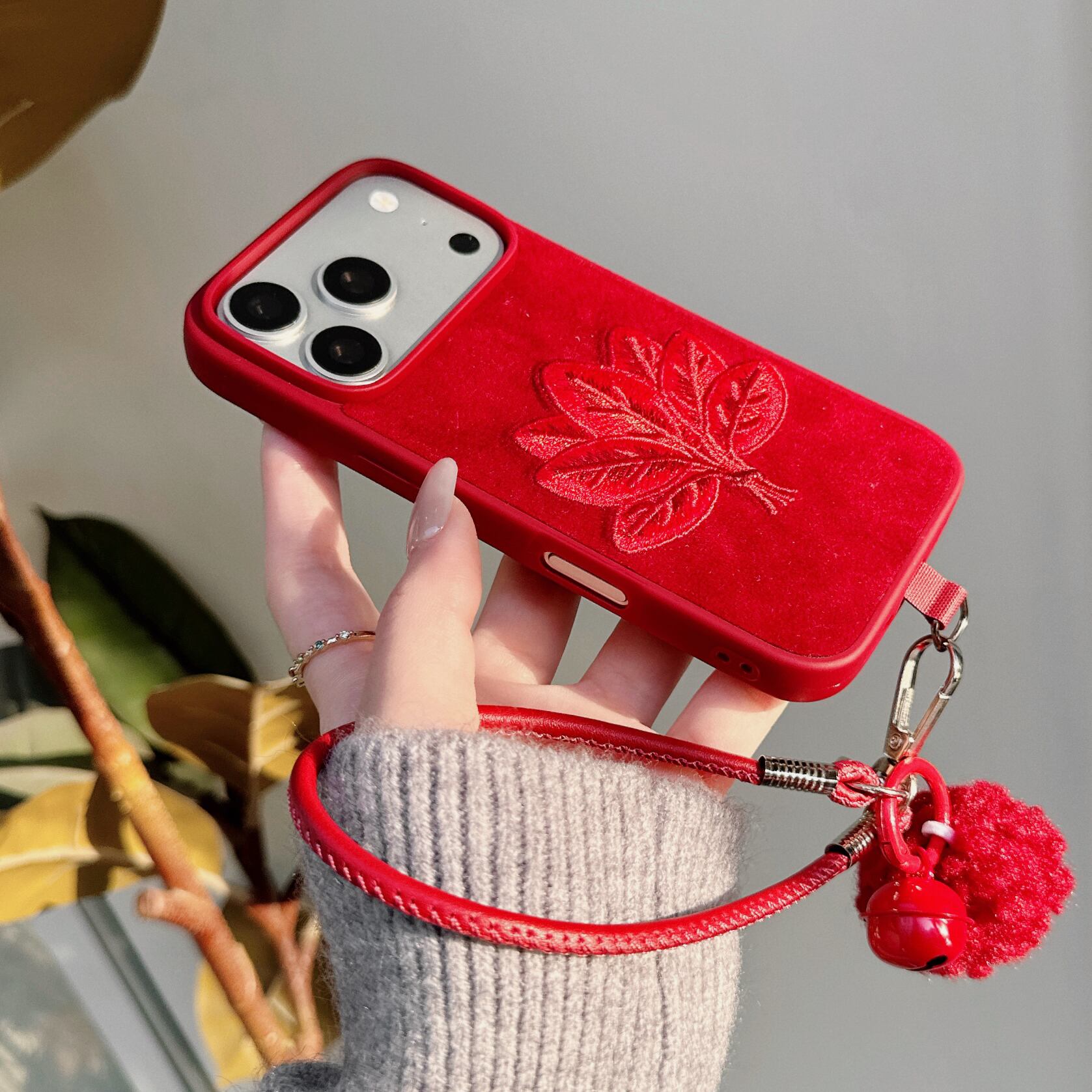 木の葉 刺繍 iphone 17 16 15 14 ケース 可愛い ハンドストラップ スマホケース