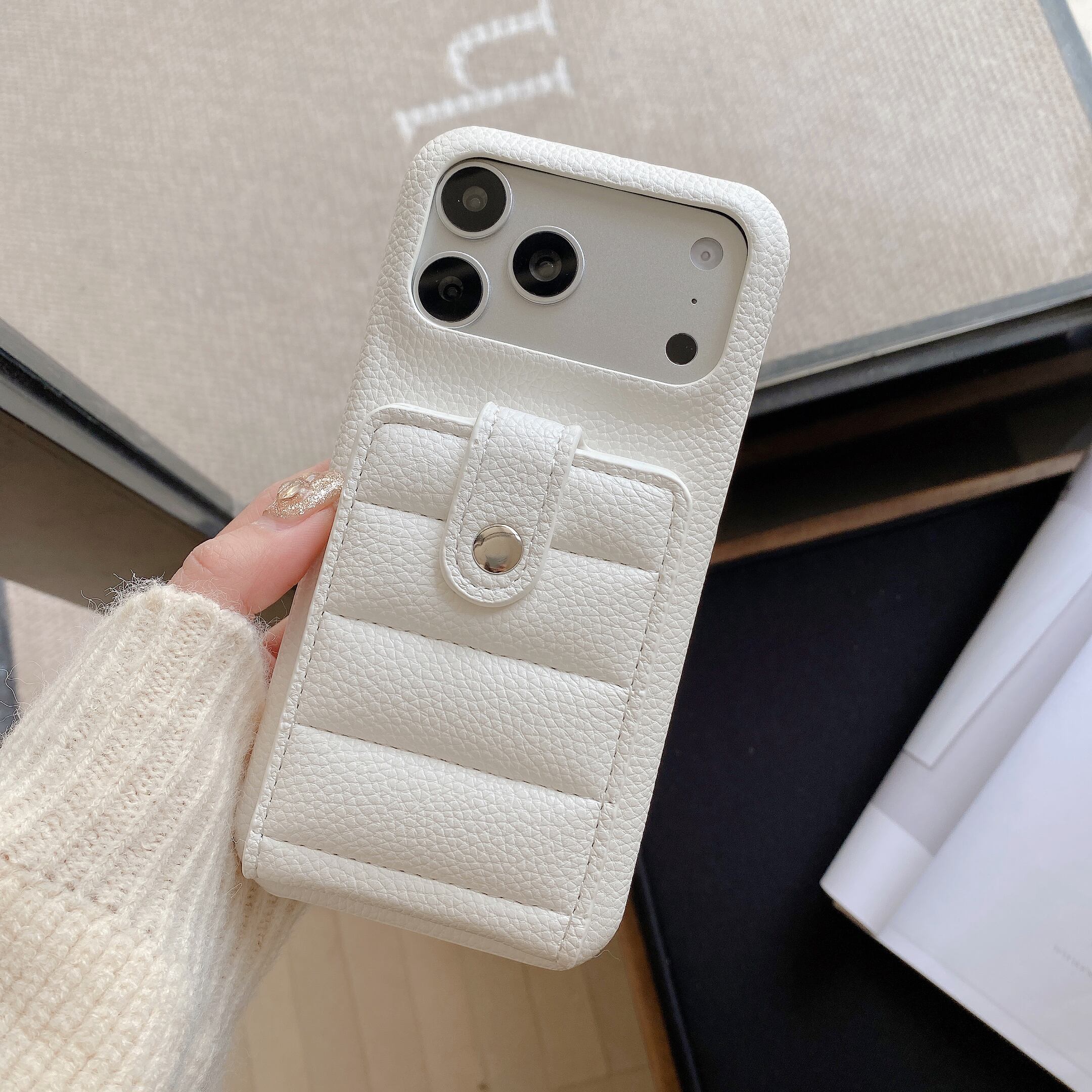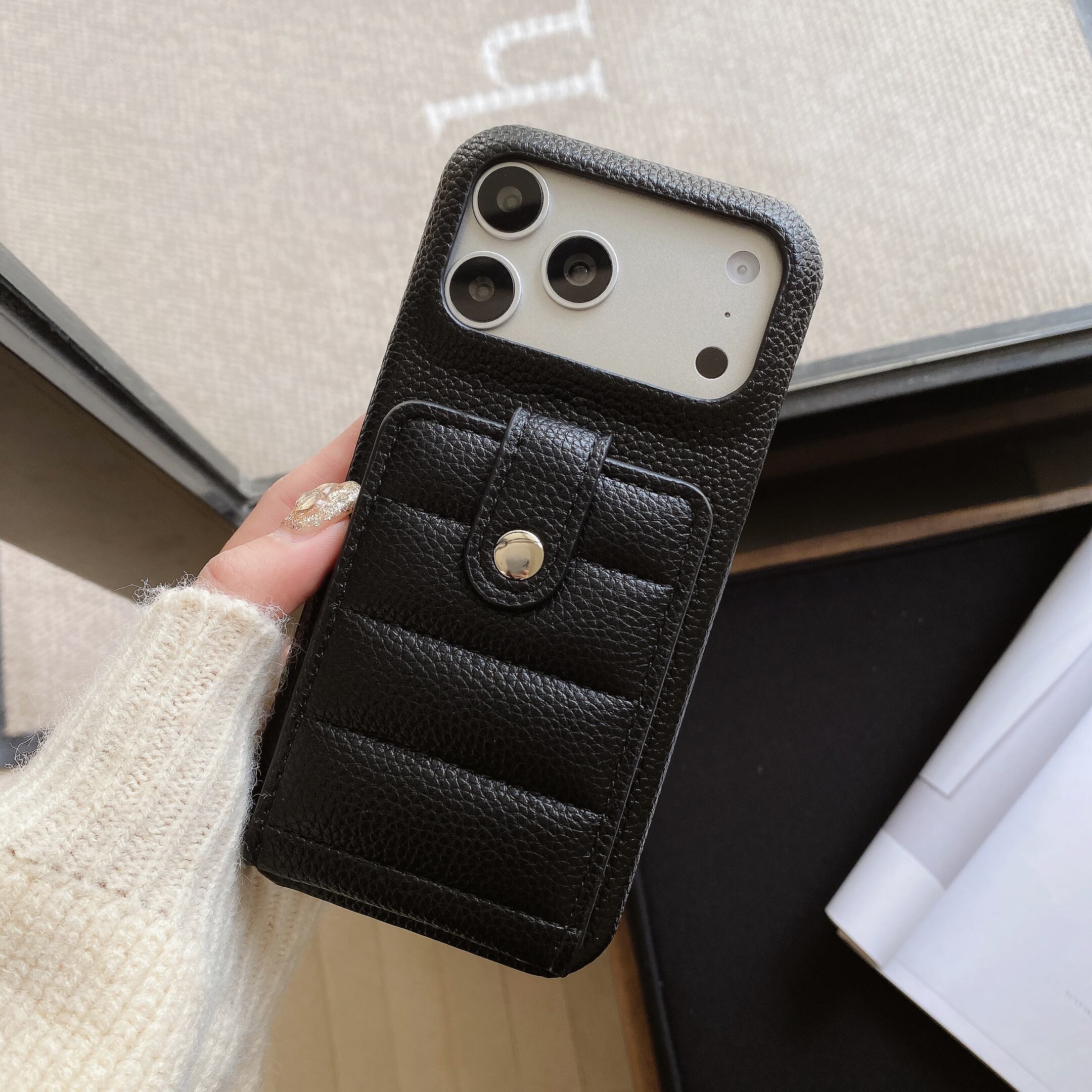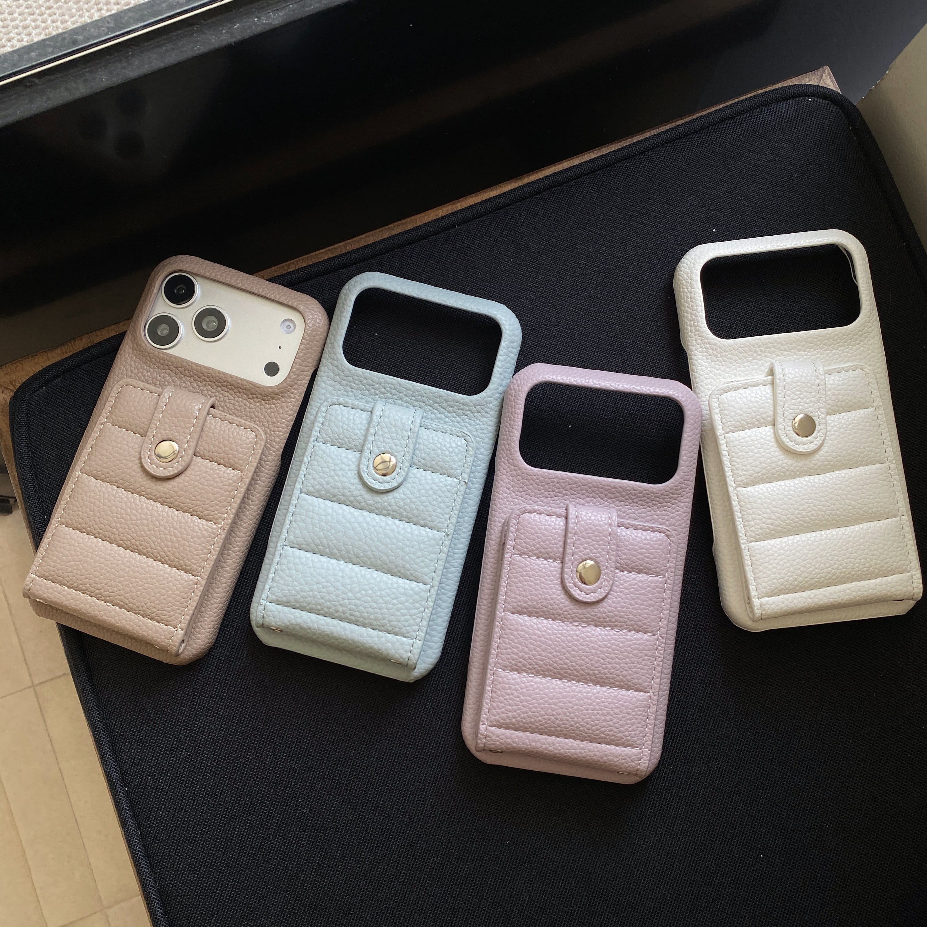 ダウン風キルティングカードケース付きiPhoneケースです。