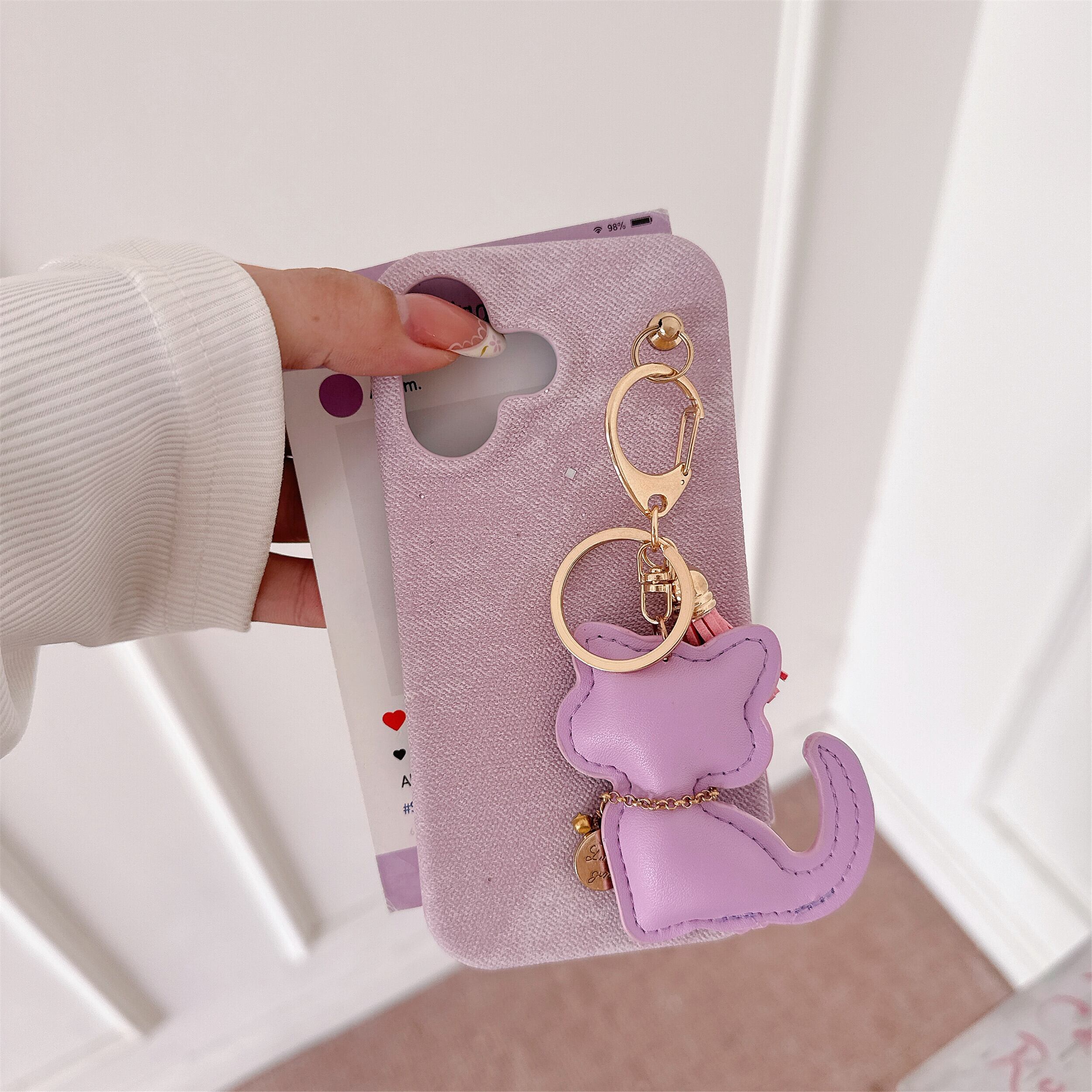 カラーデニム柄のPUレザーに、猫のキーホルダーがとってもキュート!