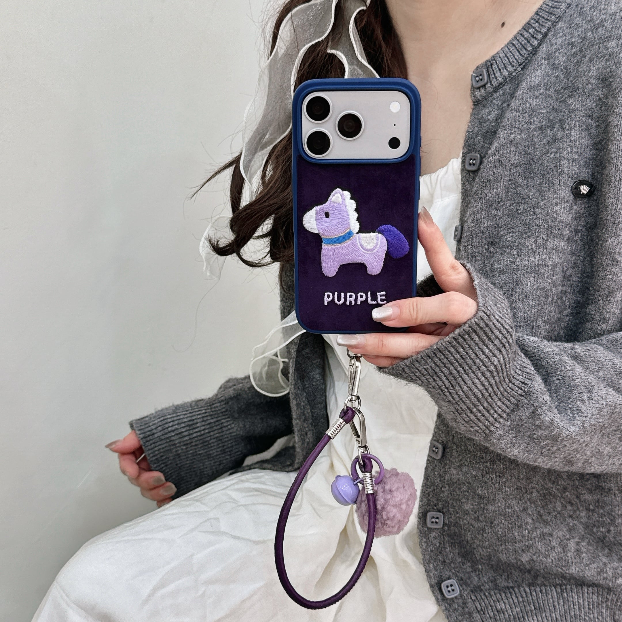 iPhone 17 16 15 14 ケース パープル 馬 うま 刺繍 可愛い ハンドストラップ スマホケース