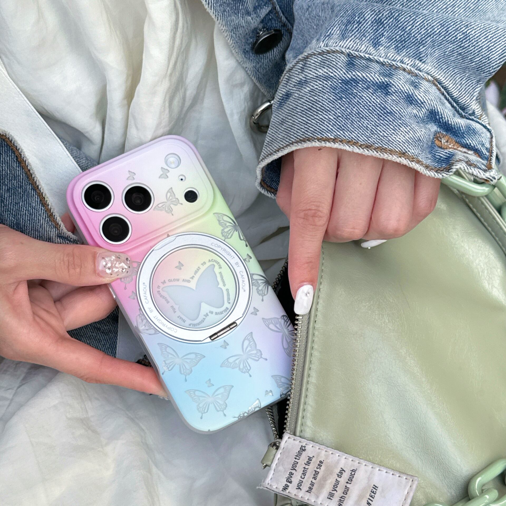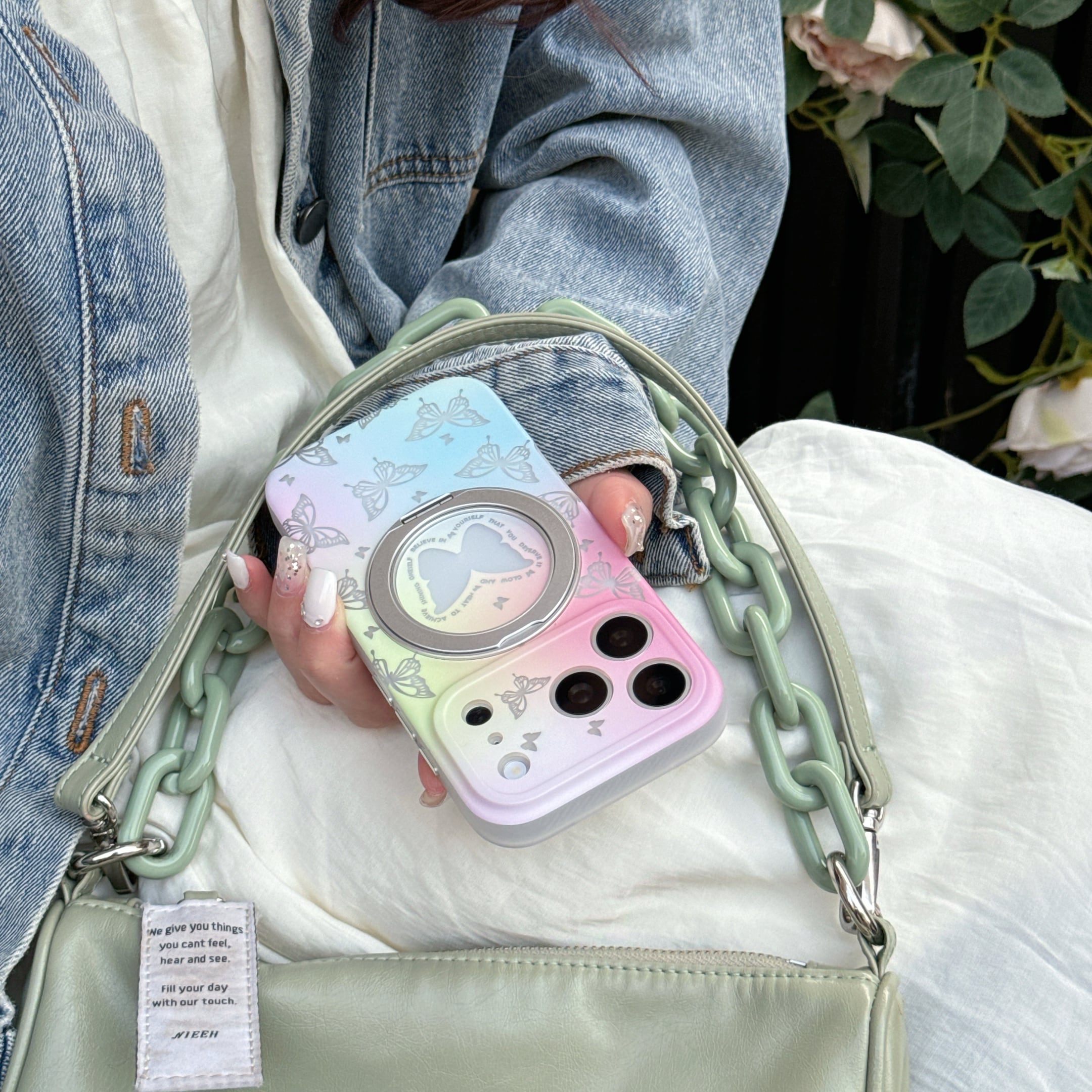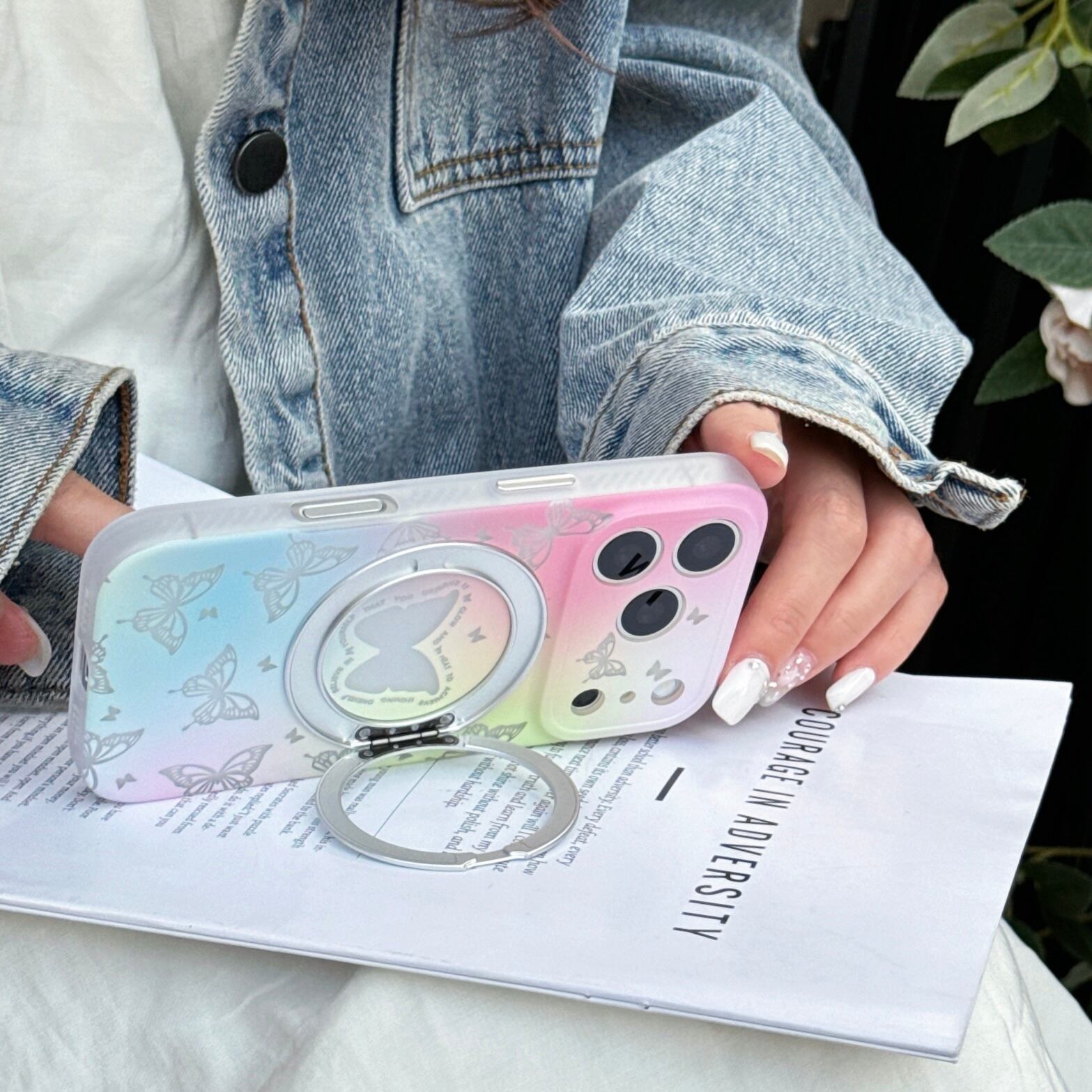 【360度回転スタンド】iPhone 17 16 15 ケース 二重IMD 耐衝撃 ハイブリッドケース かわいい 蝶々 グラデーション