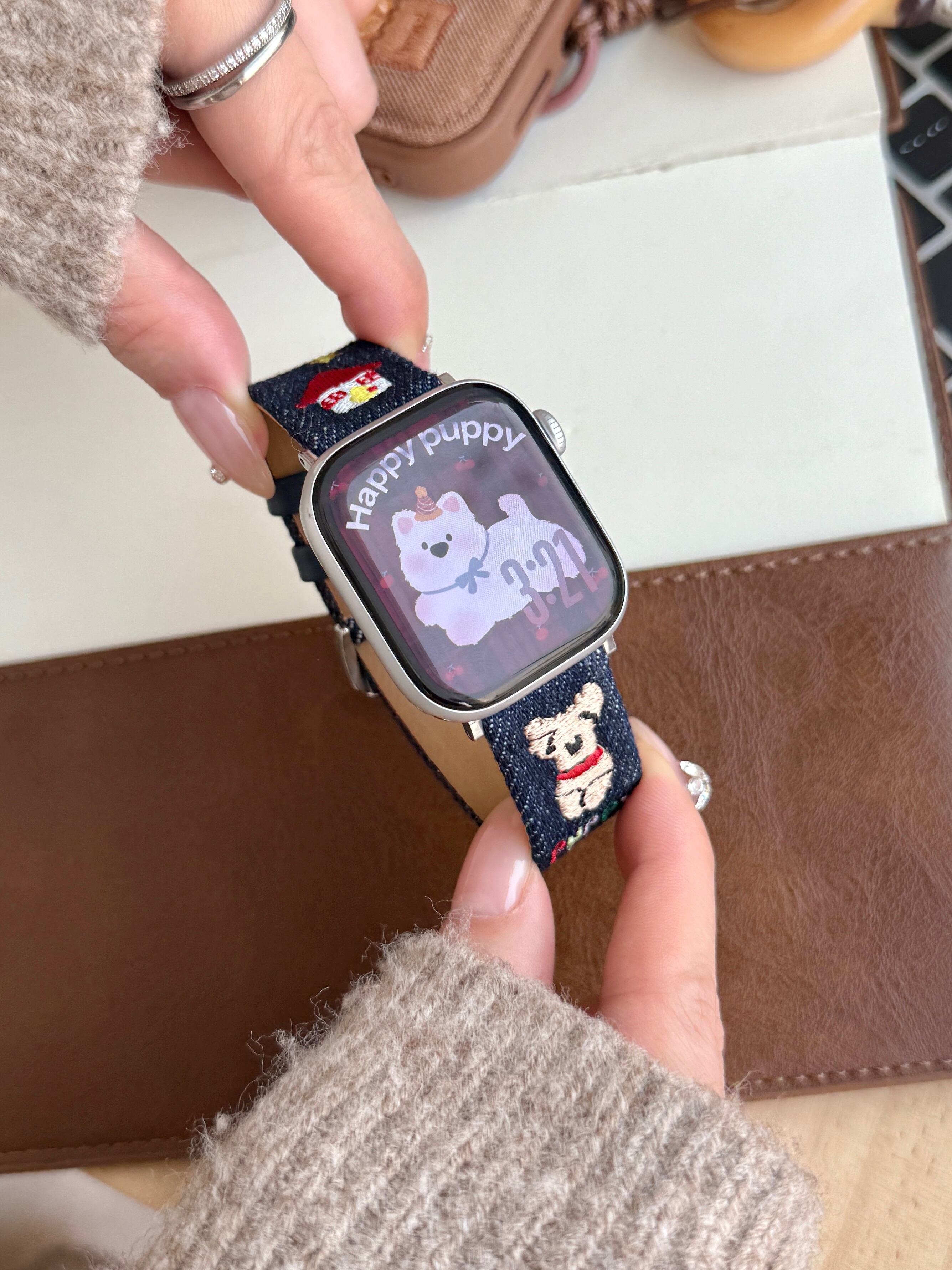 犬 刺繍 Apple Watch バンド デニム アップルウォッチバンド Series 11 10 9 SE3 Ultra3 対応 交換ベルト 動物 ワンちゃん かわいい