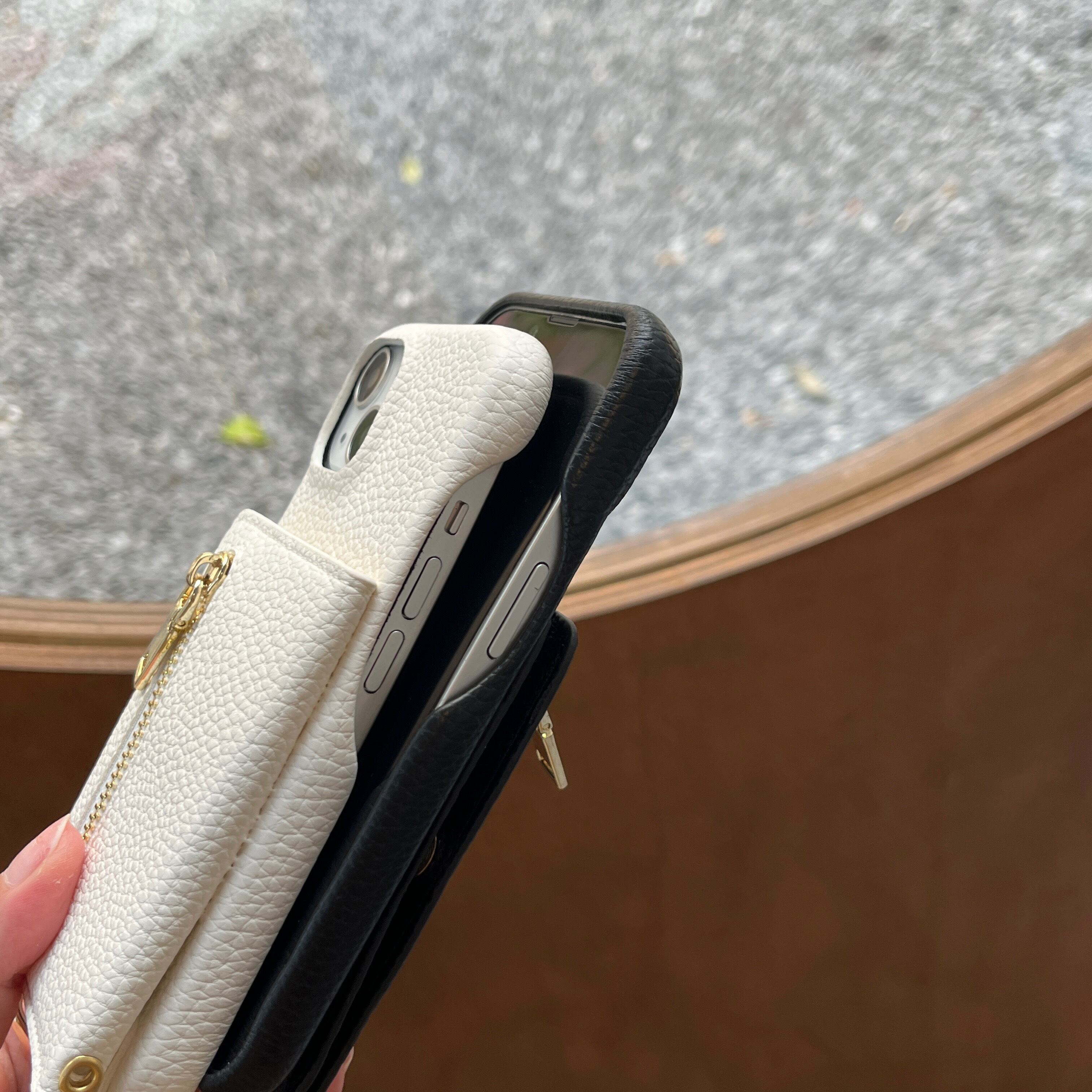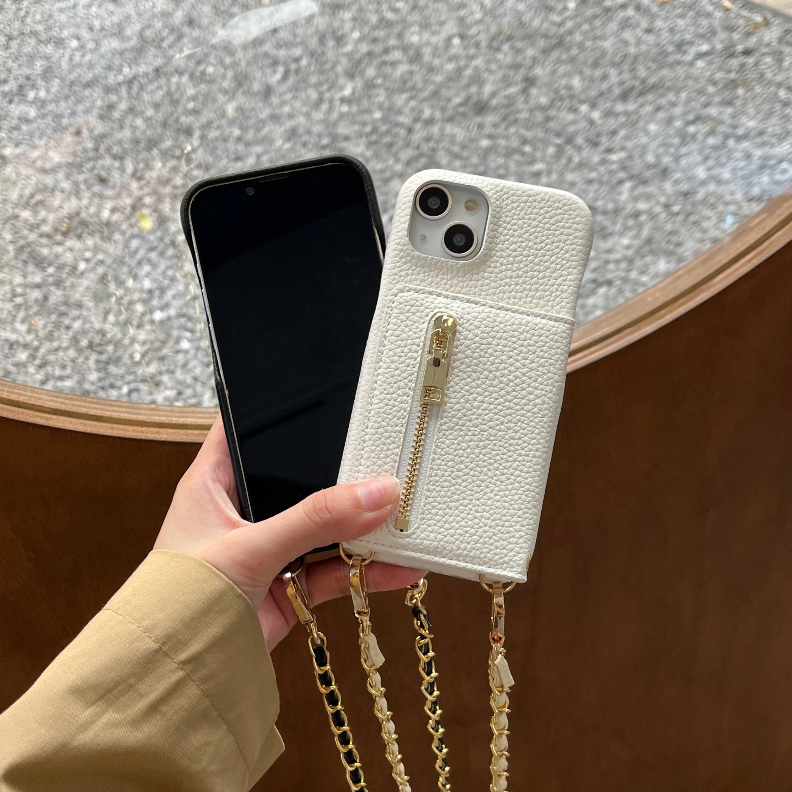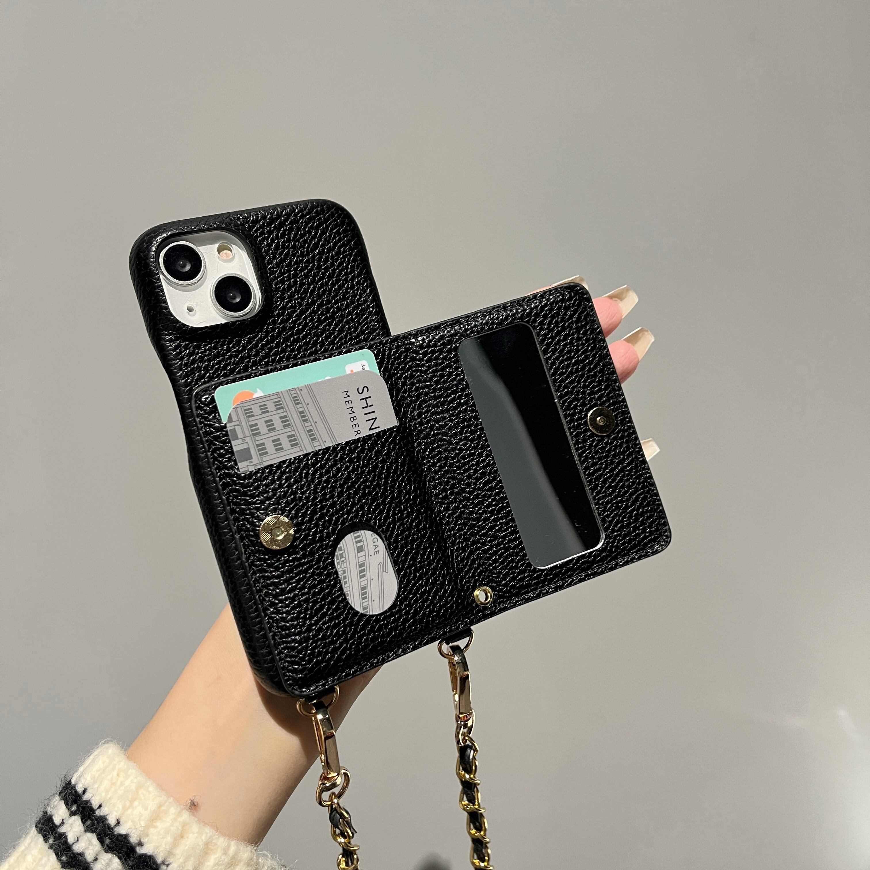ミラー&ファスナー付き iPhone 16 15 14 13 12 11 ケース カード収納 レザーチェーン スマホショルダー