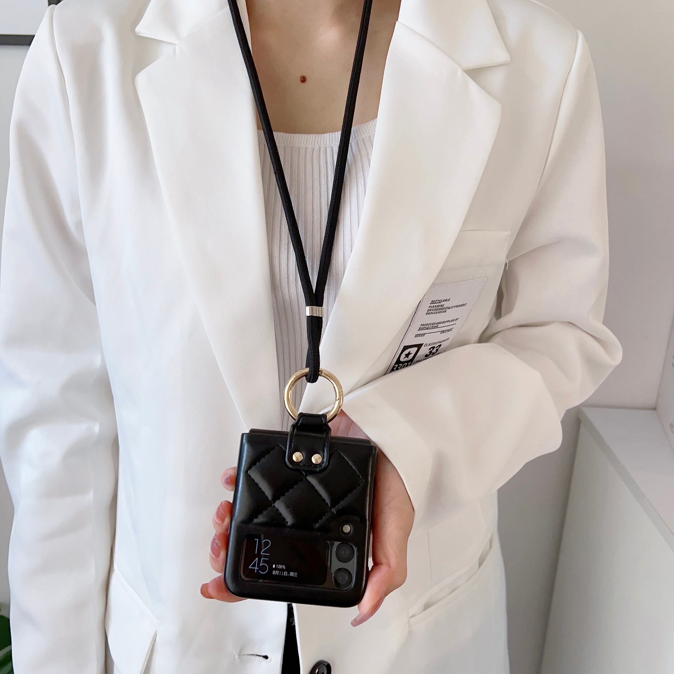 リング付き Galaxy Z Flip6/5/4/3 ケース チェック柄 キルティング ショルダーストラップ