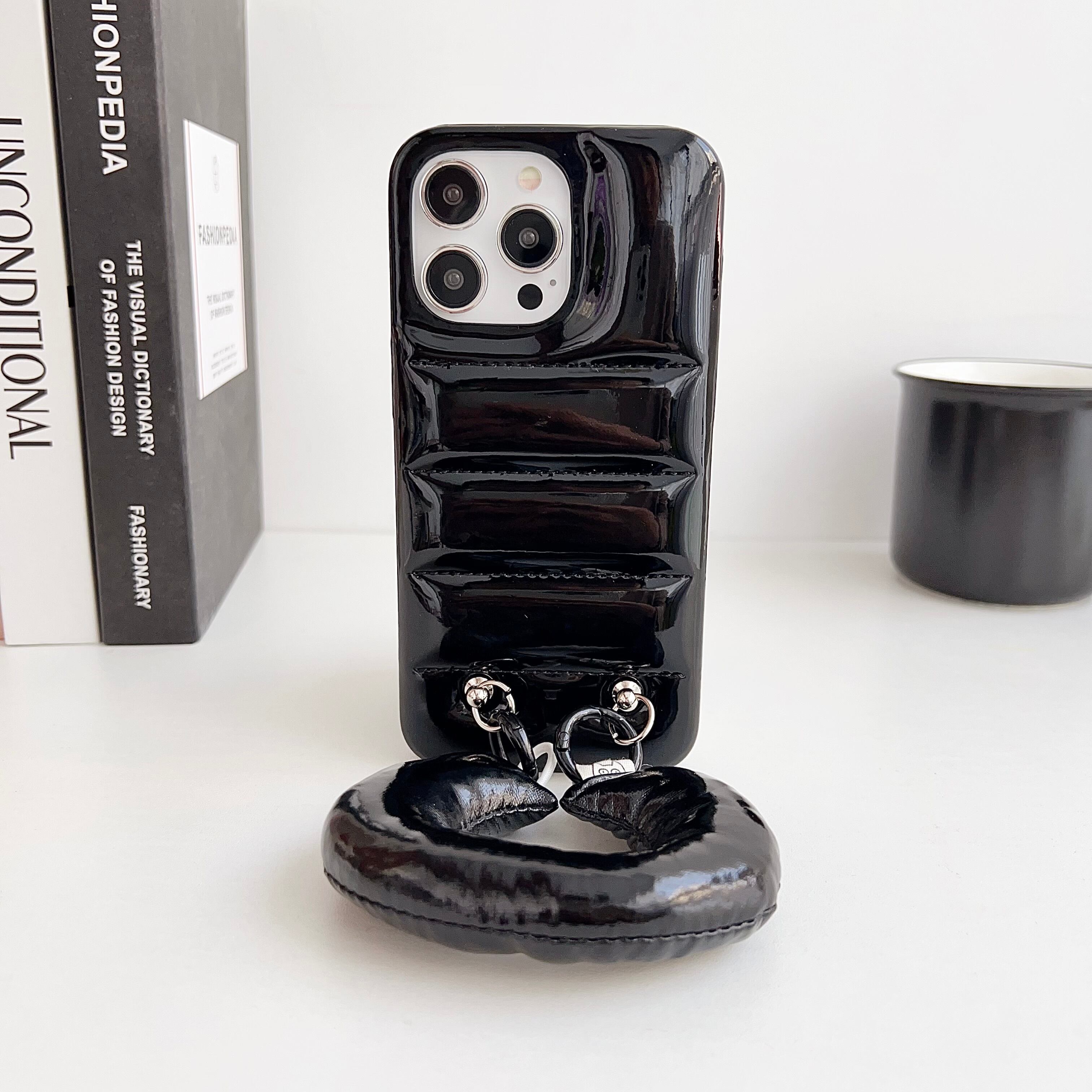 ハンドストラップ付き iPhone 17 16 15 14 13 12 ケース 光沢 ダウン おしゃれ アイフォンケース キルティング 保護カバー