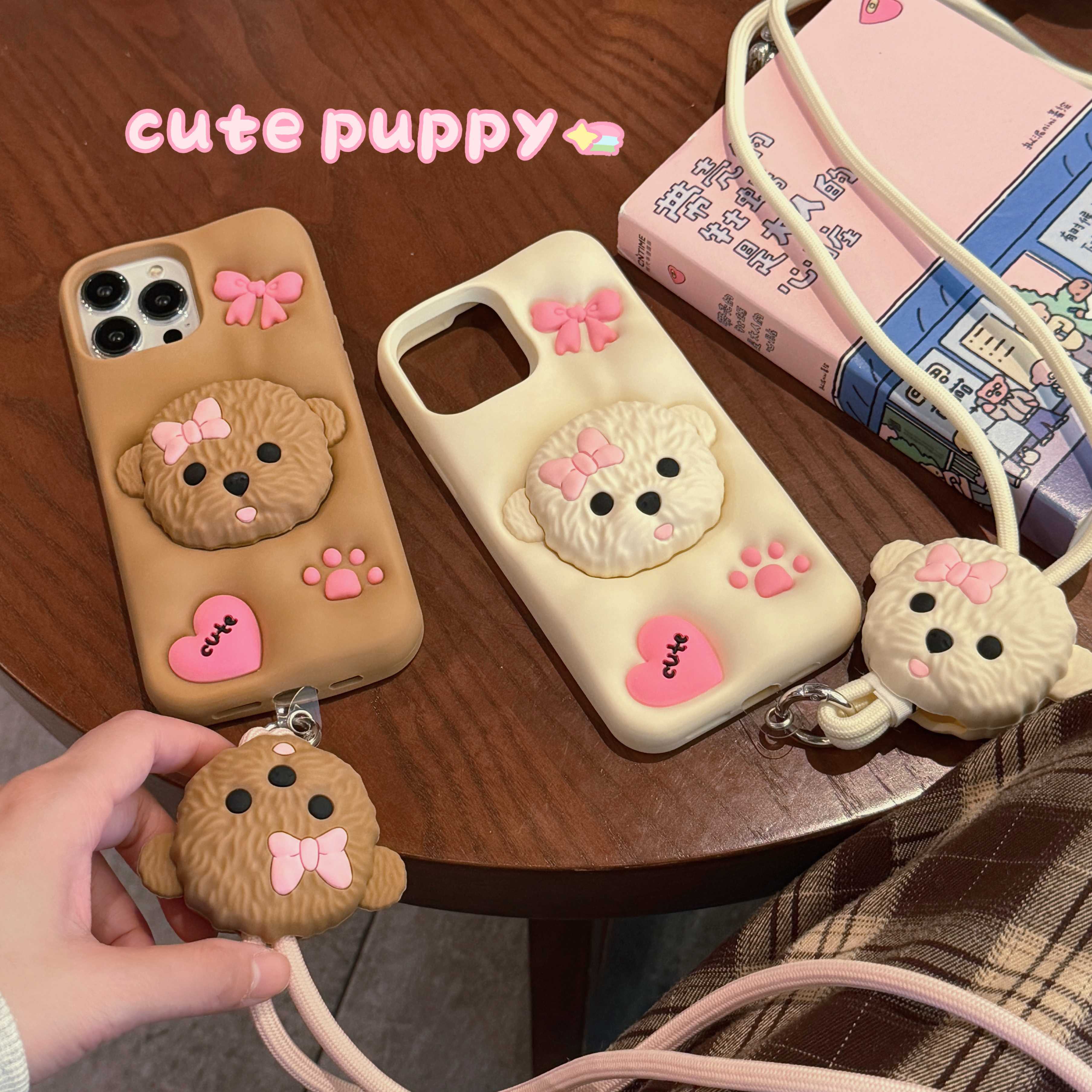 可愛い iPhone16 15 14 13 12 11 ケース ネックストラップ付き かわいい 動物 犬 プードル スタンド機能 シリコンケース 耐衝撃