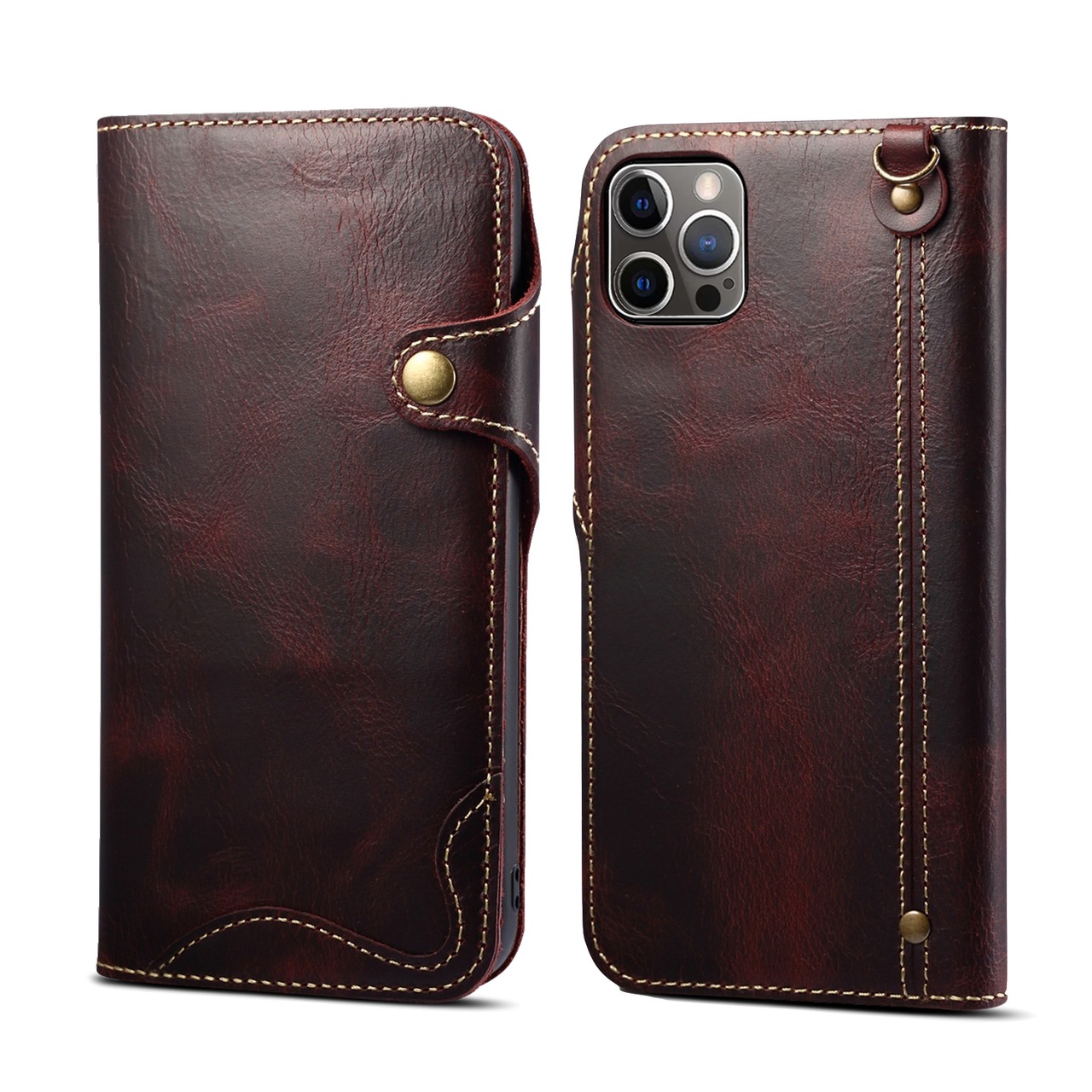 オイルレザー iPhone 17 16 15 14 13 12 11 手帳型ケース レザーケース 本革 ストラップ カード収納 ワインレッド