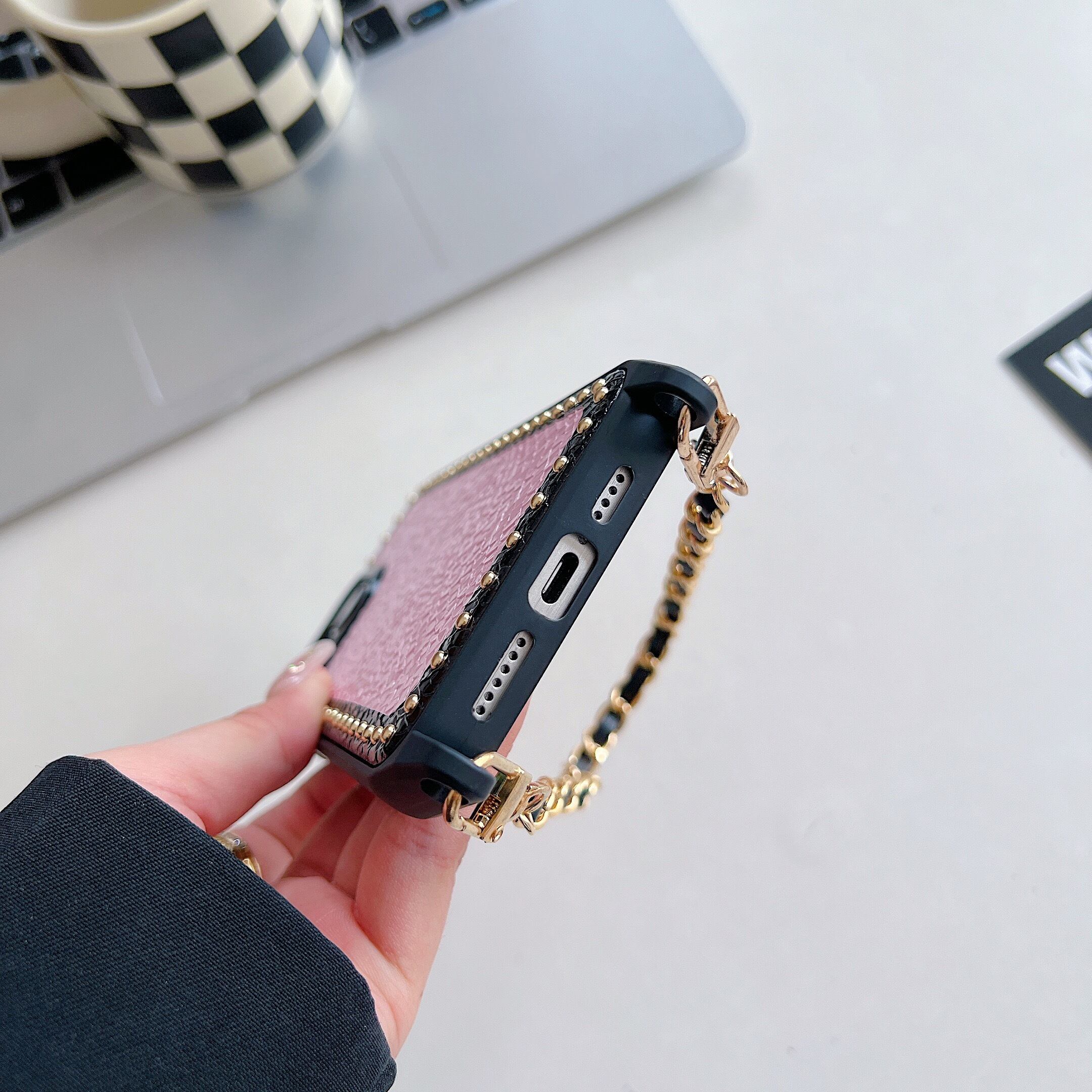 手ぶらで持ち歩けるレザーチェーンストラップで、