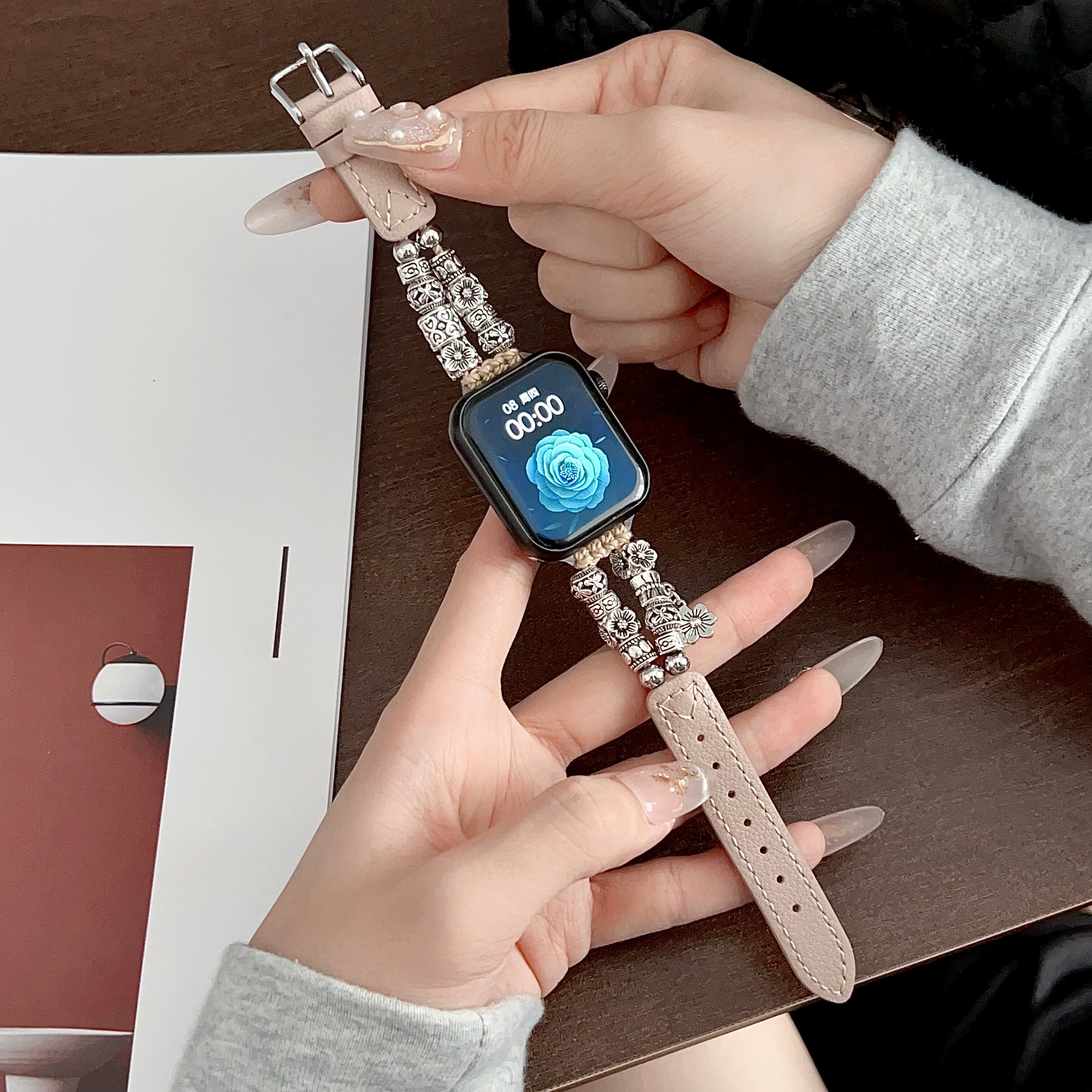 ビーズ&本革 Apple Watchバンド アップルウォッチバンド 49/45/44/42mm 41/40/38mm レザーバンド 交換ベルト おしゃれ 腕時計バンド