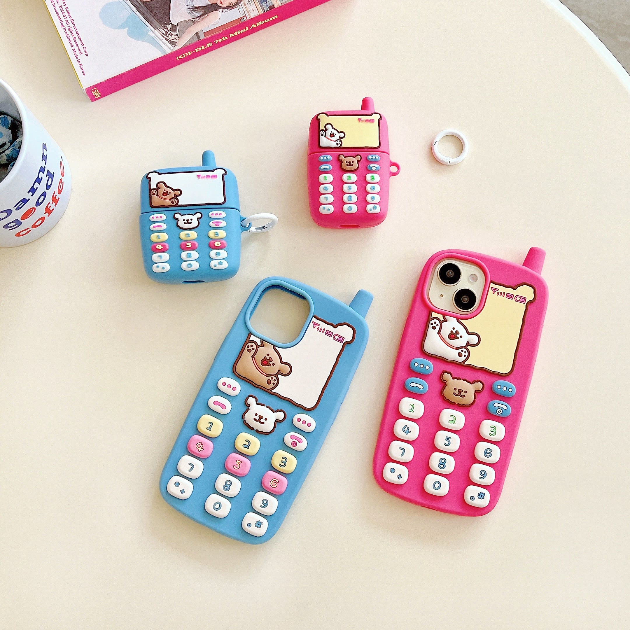 AirPodsケース, シリコンケース, くま, 電話, レトロ, かわいい, おしゃれ, カラフル, キーリング付き, 韓国, スマホアクセサリー