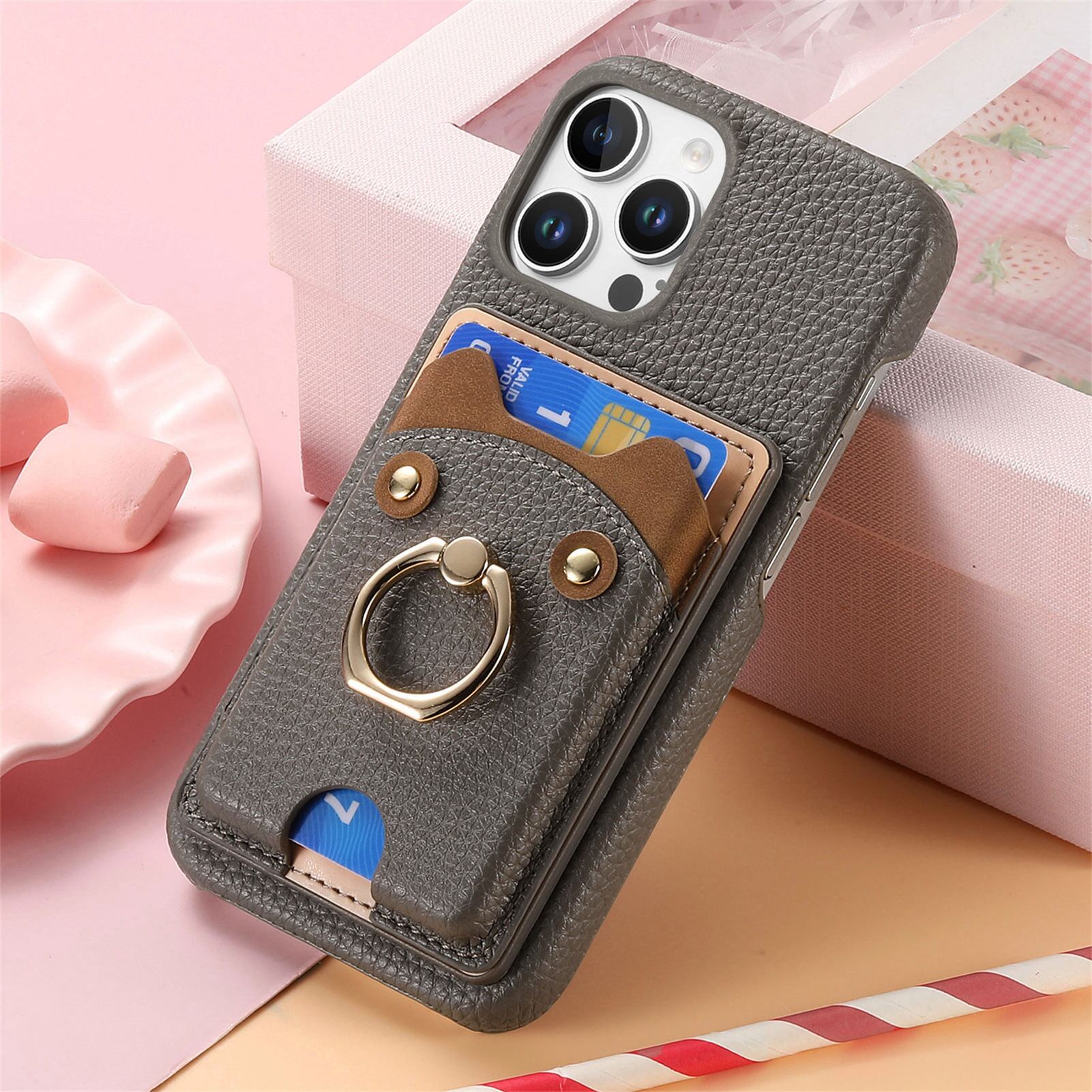 スマホリング付き iPhoneケース 猫デザイン カード収納 PUレザー