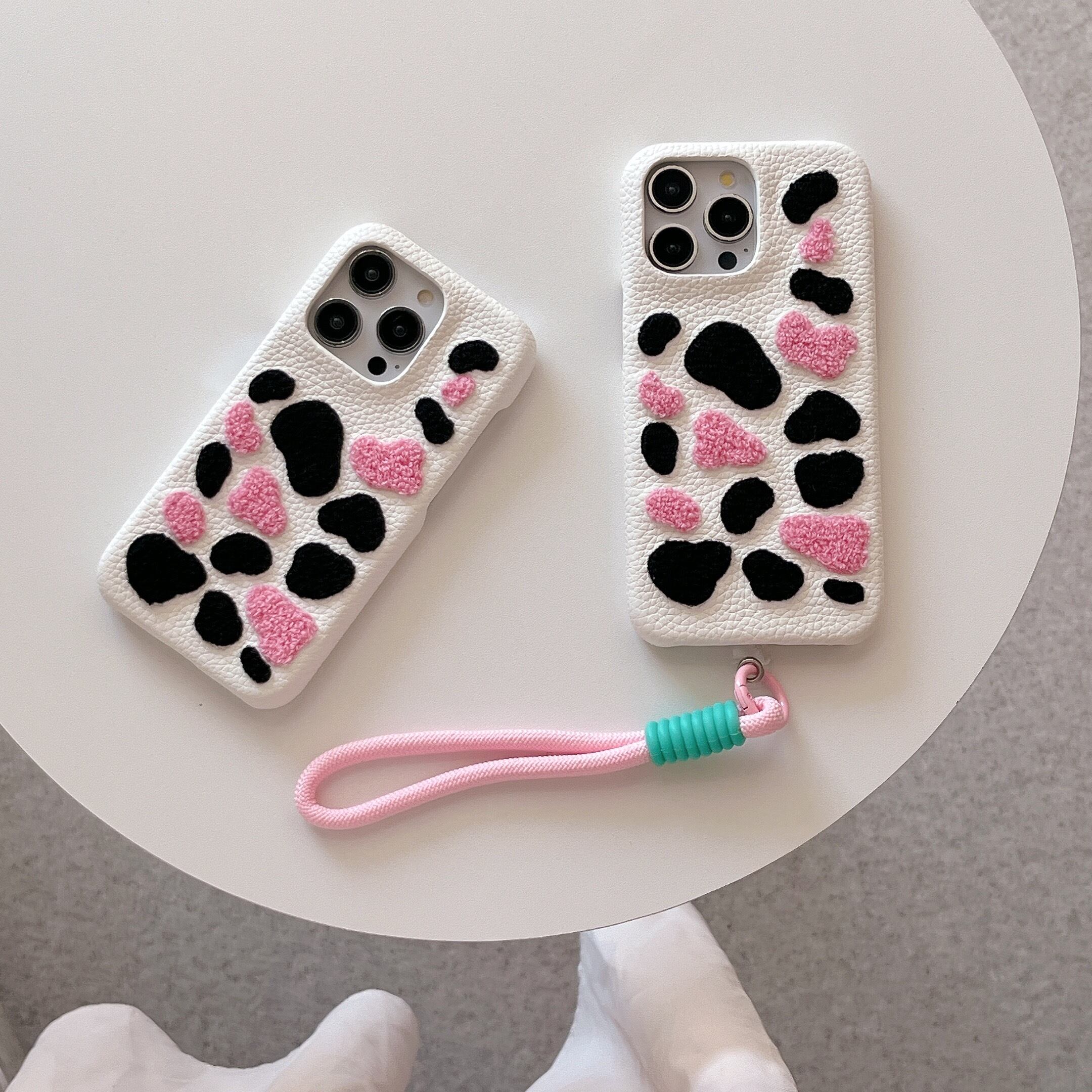 刺繍 牛柄 iphone 16 15 14 13 12 ケース 可愛い ストラップ付き スマホケース おしゃれ puレザー